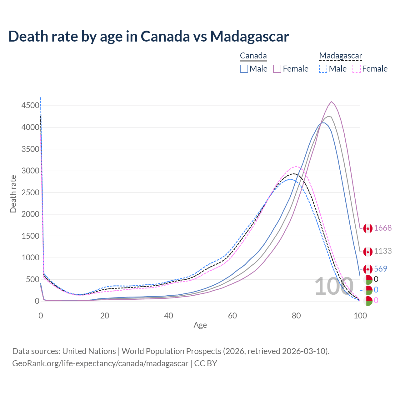 In Canada, the most common age of death is 90, compared to 0 in Madagascar. The median age of death is 86.4 in Canada and 72.2 in Madagascar, meaning only half of each cohort is expected to live past that age.