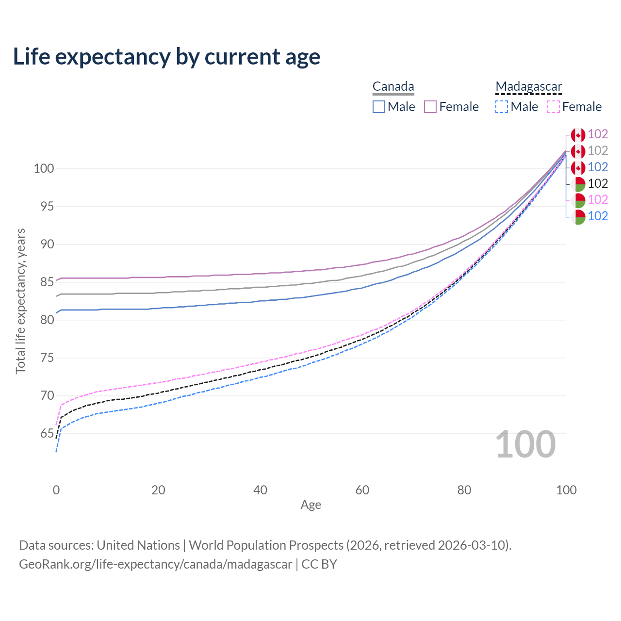 This life expectancy calculator shows the odds of living to 100, 95, 90, and below based on current age for both males and females in Canada and Madagascar, along with mean and median age of death. The calculations are based on the 2026 life tables (actuarial tables) from the UN World Population Prospects.