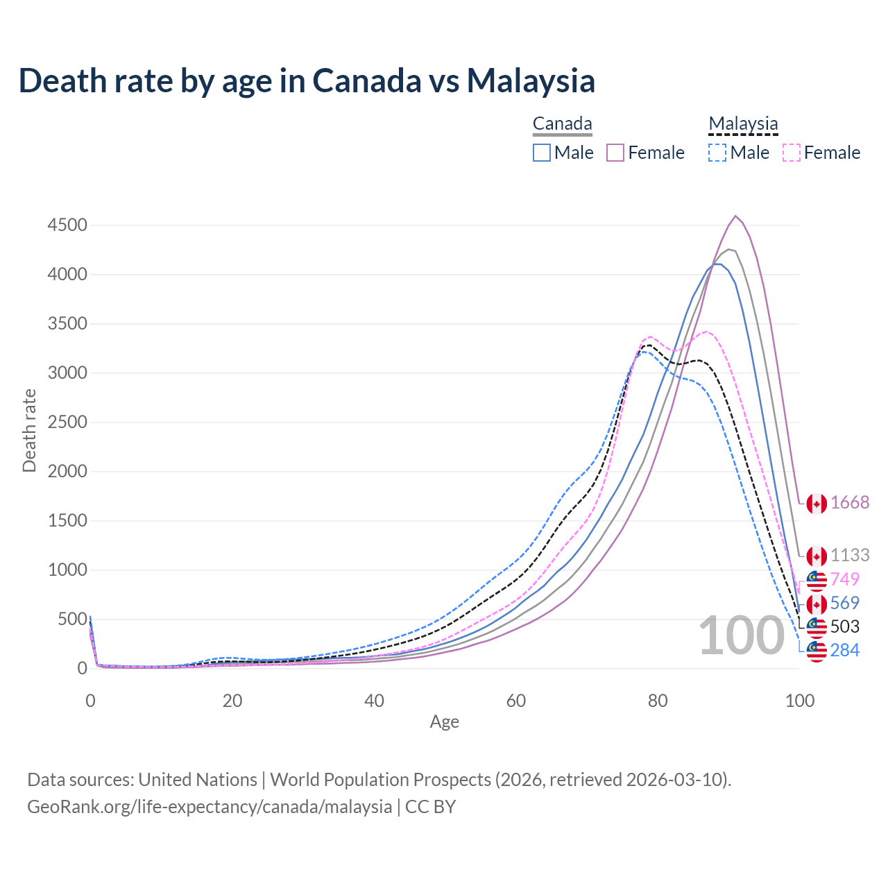 This life expectancy calculator shows the odds of living to 100, 95, 90, and below based on current age for both males and females in Canada and Malaysia, along with mean and median age of death. The calculations are based on the 2026 life tables (actuarial tables) from the UN World Population Prospects.