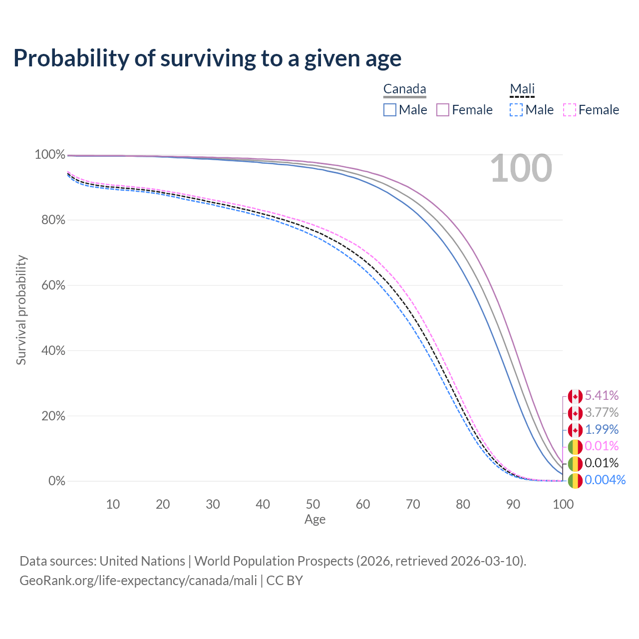 This life expectancy calculator shows the odds of living to 100, 95, 90, and below based on current age for both males and females in Canada and Mali, along with mean and median age of death. The calculations are based on the 2026 life tables (actuarial tables) from the UN World Population Prospects.