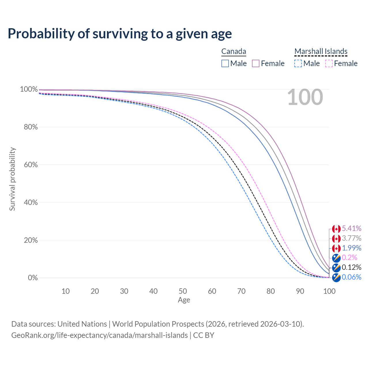 This life expectancy calculator shows the odds of living to 100, 95, 90, and below based on current age for both males and females in Canada and the Marshall Islands, along with mean and median age of death. The calculations are based on the 2026 life tables (actuarial tables) from the UN World Population Prospects.