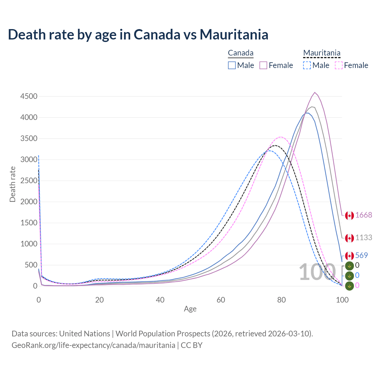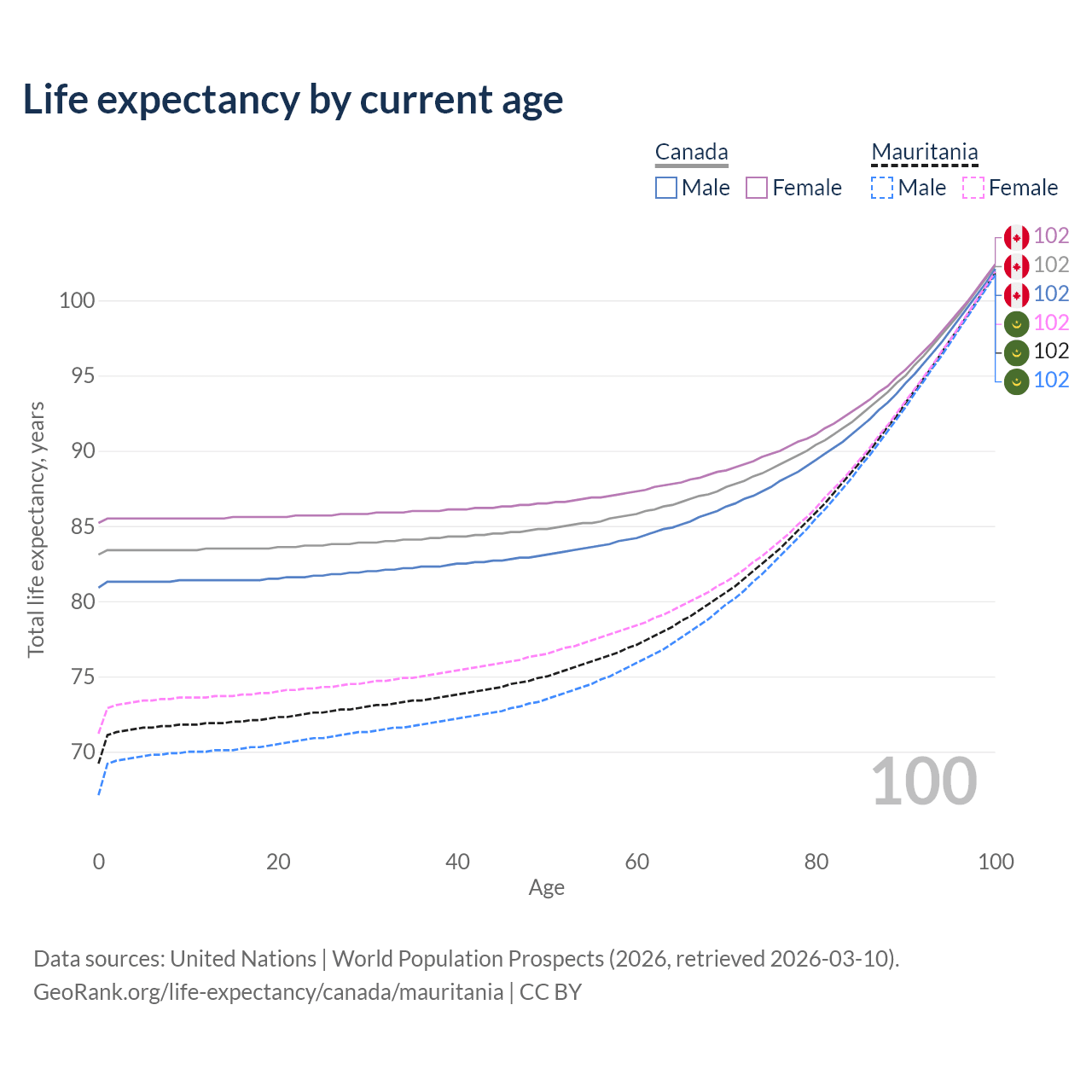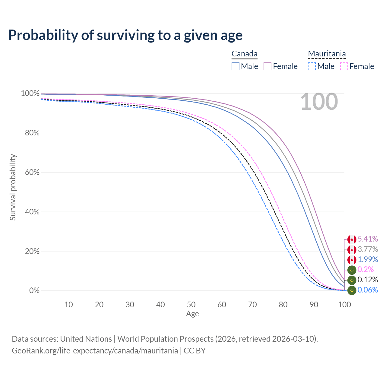 This life expectancy calculator shows the odds of living to 100, 95, 90, and below based on current age for both males and females in Canada and Mauritania, along with mean and median age of death. The calculations are based on the 2026 life tables (actuarial tables) from the UN World Population Prospects.