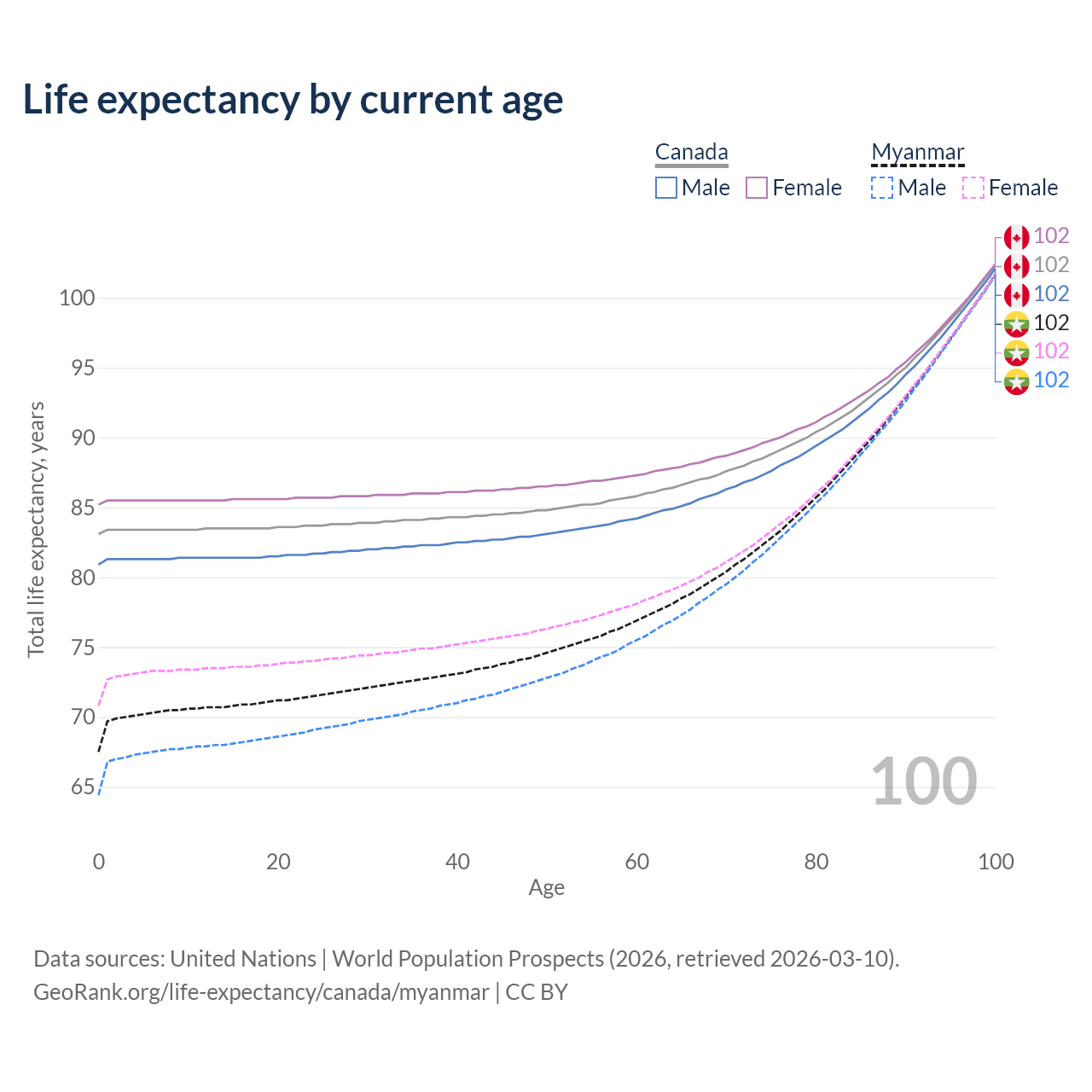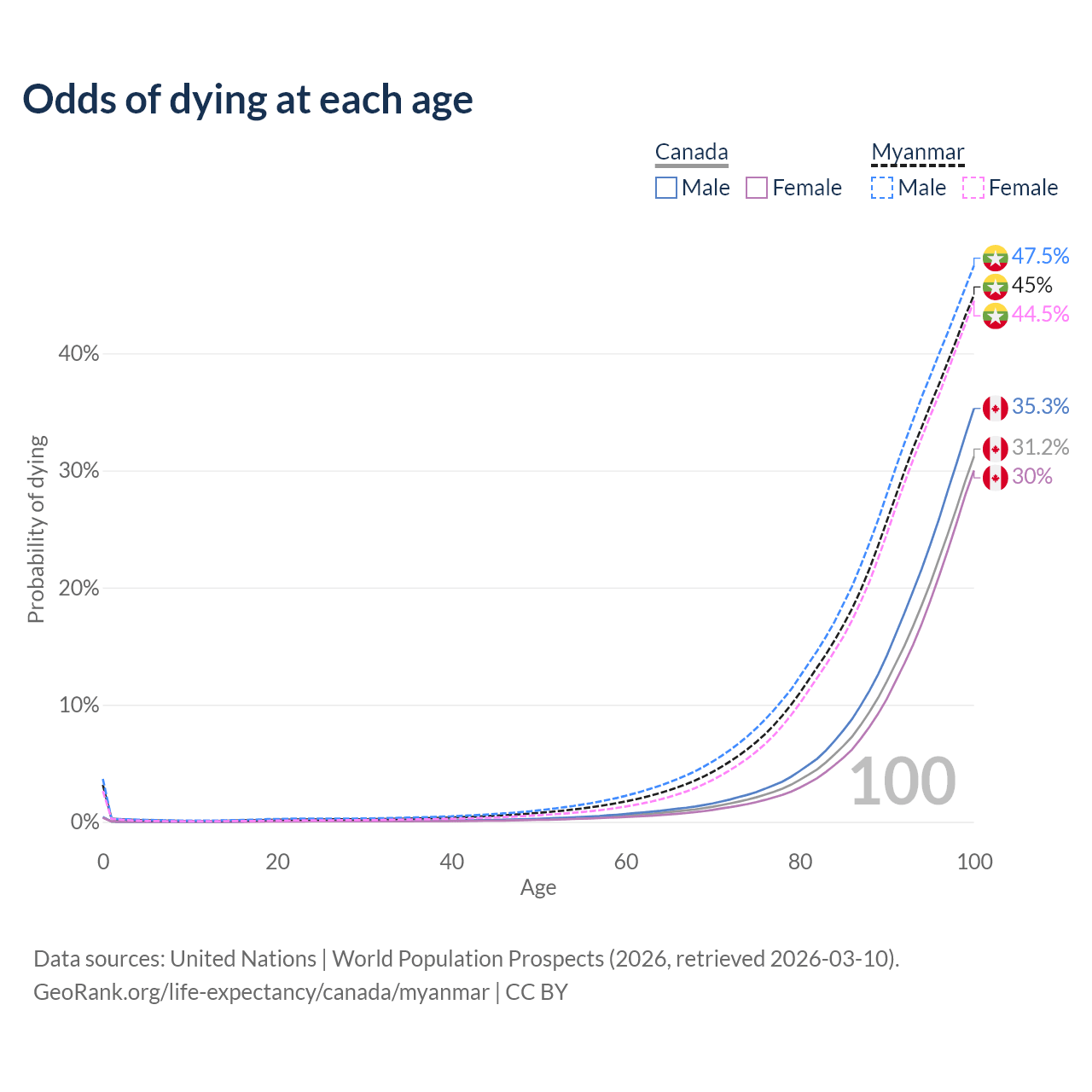 This life expectancy calculator shows the odds of living to 100, 95, 90, and below based on current age for both males and females in Canada and Myanmar, along with mean and median age of death. The calculations are based on the 2026 life tables (actuarial tables) from the UN World Population Prospects.