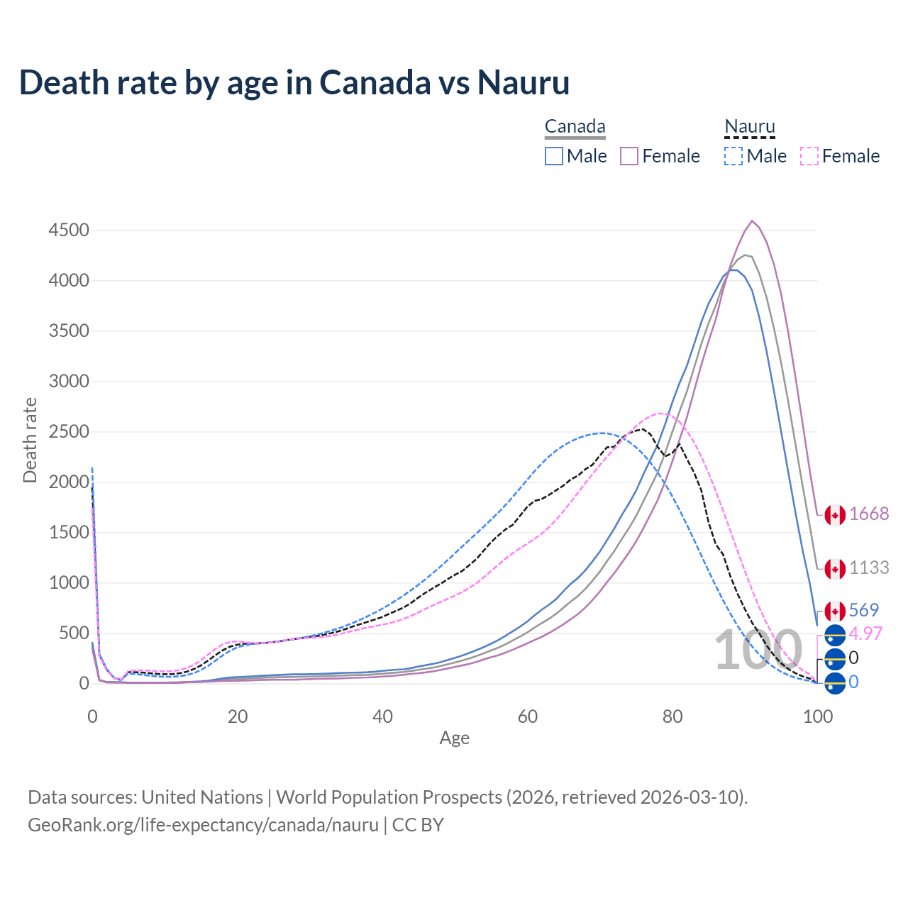 In Canada, the most common age of death is 90, compared to 76 in Nauru. The median age of death is 86.4 in Canada and 67.3 in Nauru, meaning only half of each cohort is expected to live past that age.