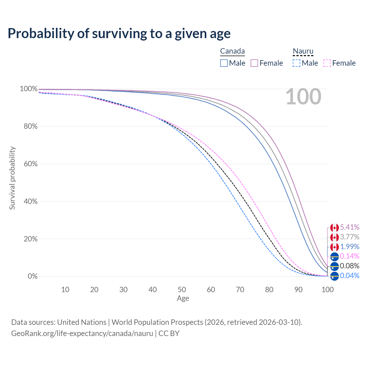 This life expectancy calculator shows the odds of living to 100, 95, 90, and below based on current age for both males and females in Canada and Nauru, along with mean and median age of death. The calculations are based on the 2026 life tables (actuarial tables) from the UN World Population Prospects.