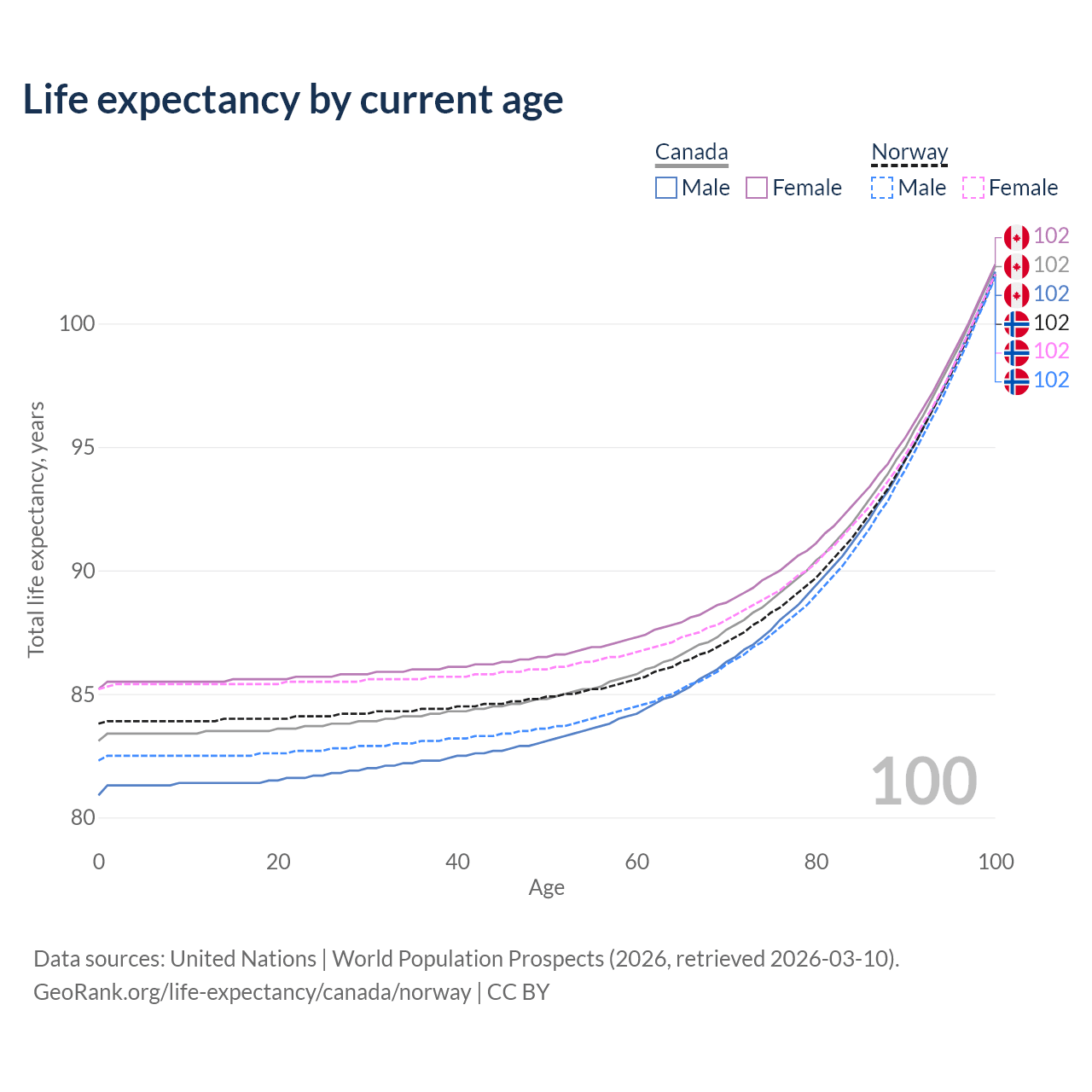 This life expectancy calculator shows the odds of living to 100, 95, 90, and below based on current age for both males and females in Canada and Norway, along with mean and median age of death. The calculations are based on the 2026 life tables (actuarial tables) from the UN World Population Prospects.