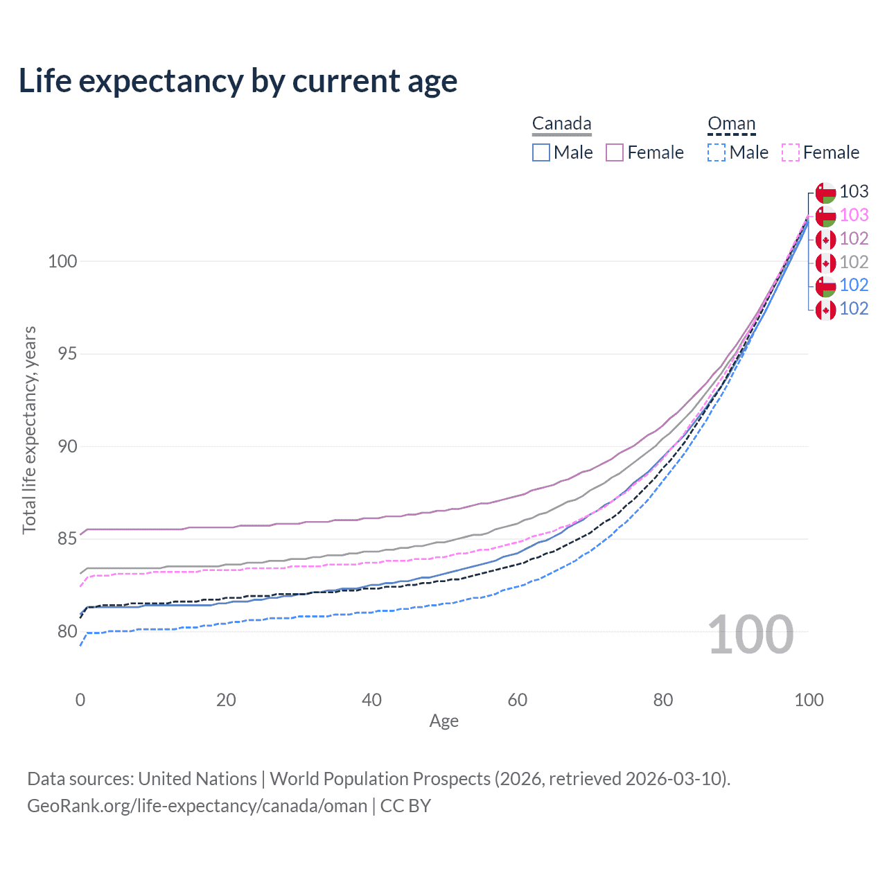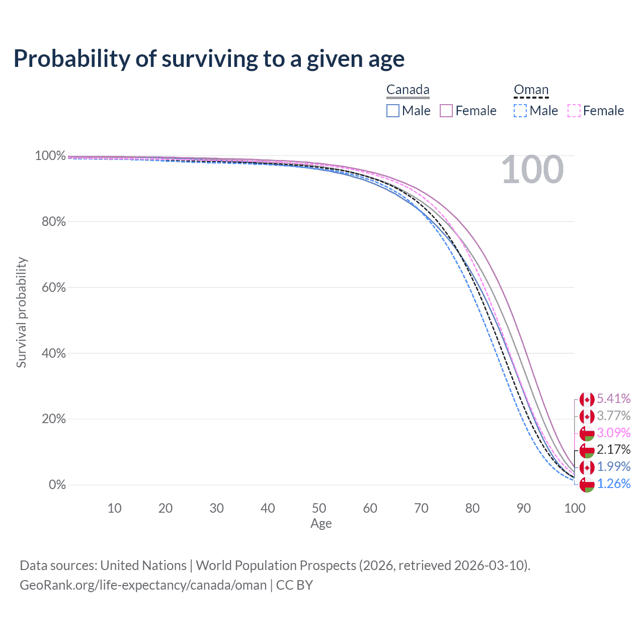This life expectancy calculator shows the odds of living to 100, 95, 90, and below based on current age for both males and females in Canada and Oman, along with mean and median age of death. The calculations are based on the 2026 life tables (actuarial tables) from the UN World Population Prospects.
