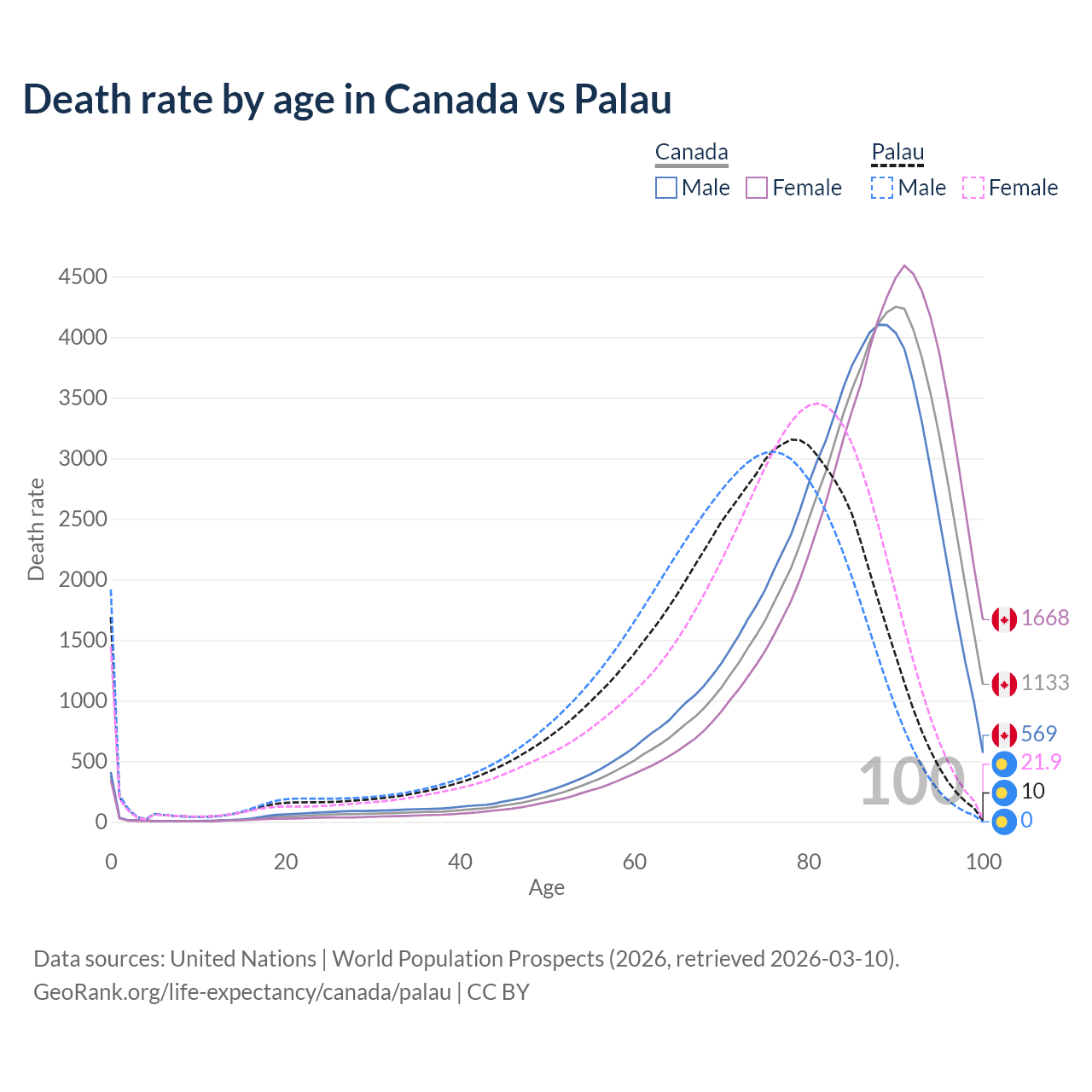 In Canada, the most common age of death is 90, compared to 78 in Palau. The median age of death is 86.4 in Canada and 73.8 in Palau, meaning only half of each cohort is expected to live past that age.