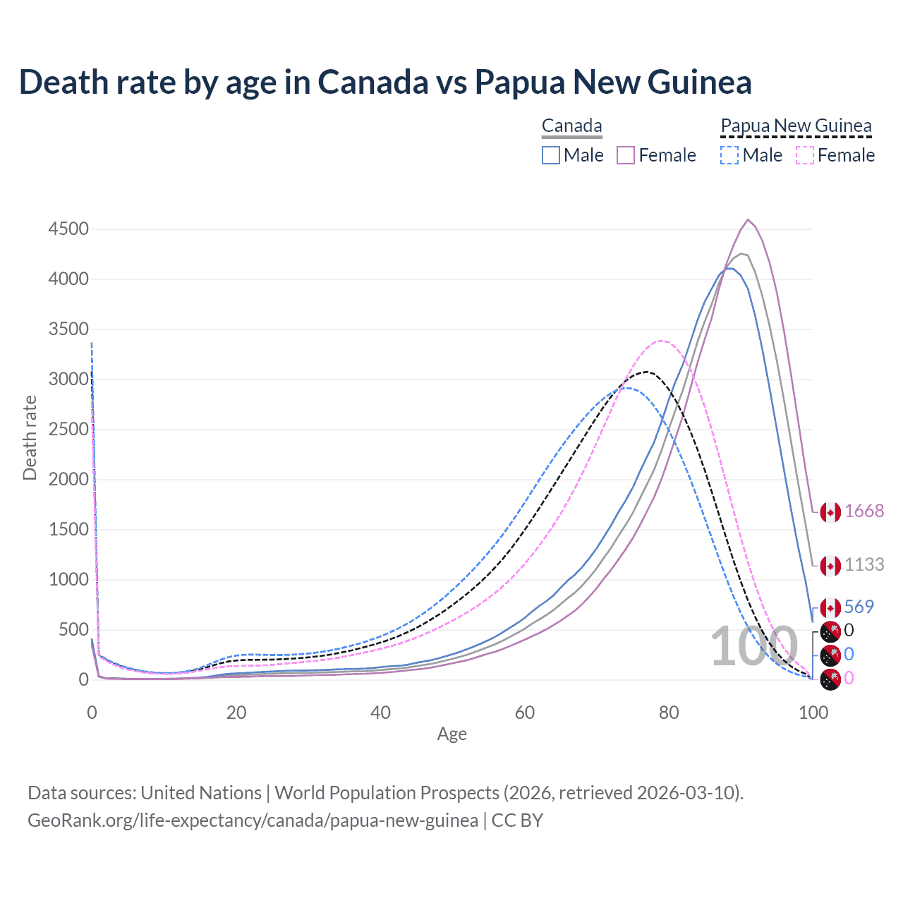 In Canada, the most common age of death is 90, compared to 0 in Papua New Guinea. The median age of death is 86.4 in Canada and 71.7 in Papua New Guinea, meaning only half of each cohort is expected to live past that age.