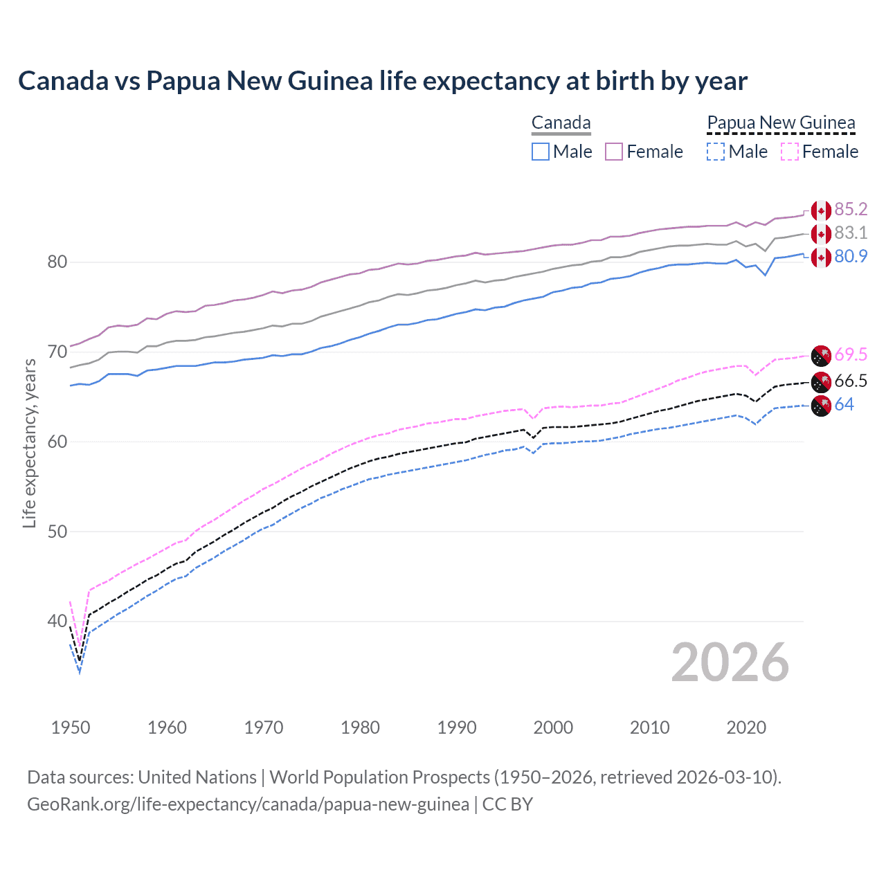 The average life expectancy at birth is 83.1 years in Canada vs 66.5 in Papua New Guinea. Canada is ranked 19/197 by life expectancy, and Papua New Guinea is 166/197. In Canada, the life expectancy is 80.9 years for males and 85.2 years for females. In Papua New Guinea, it's 64 years for males and 69.5 years for females.