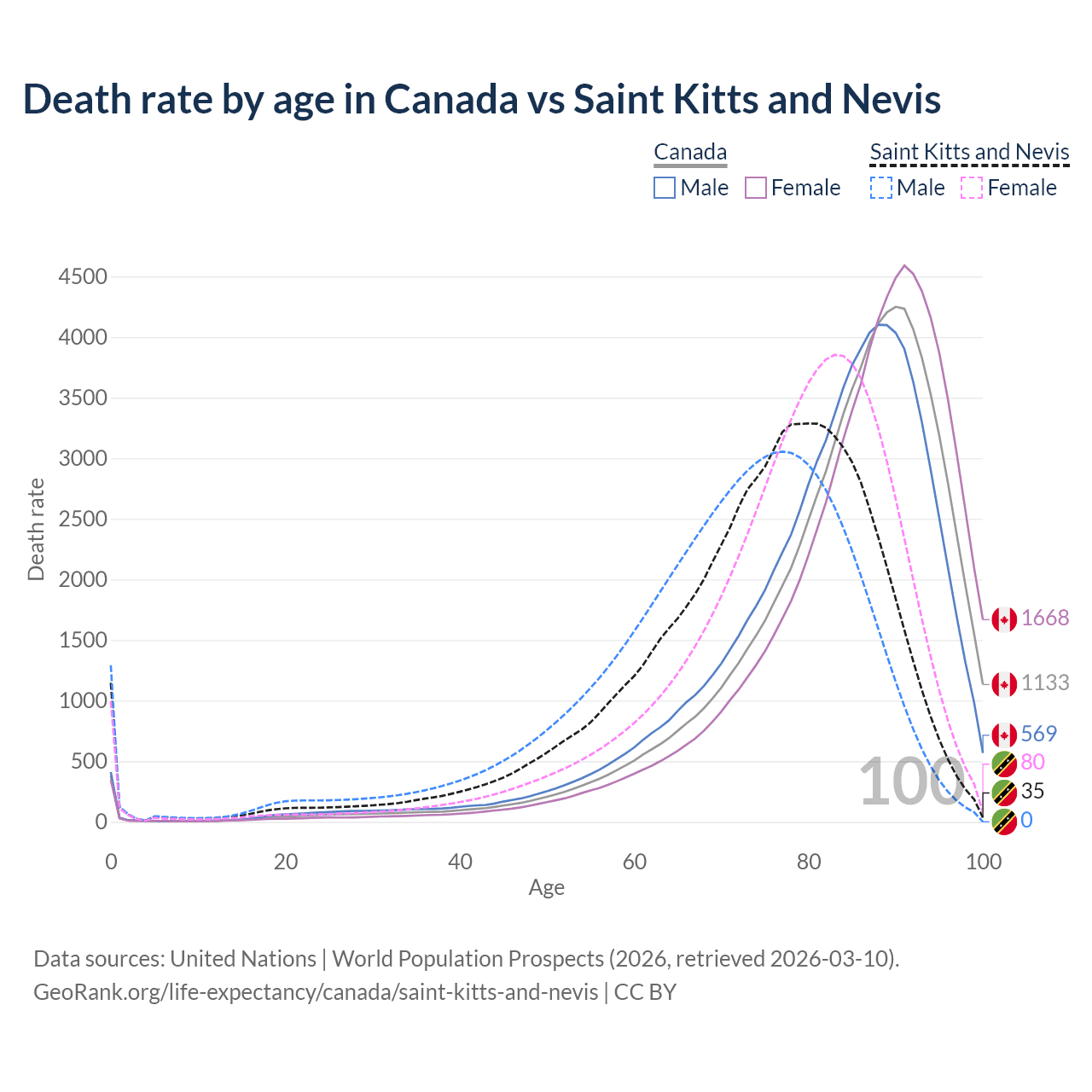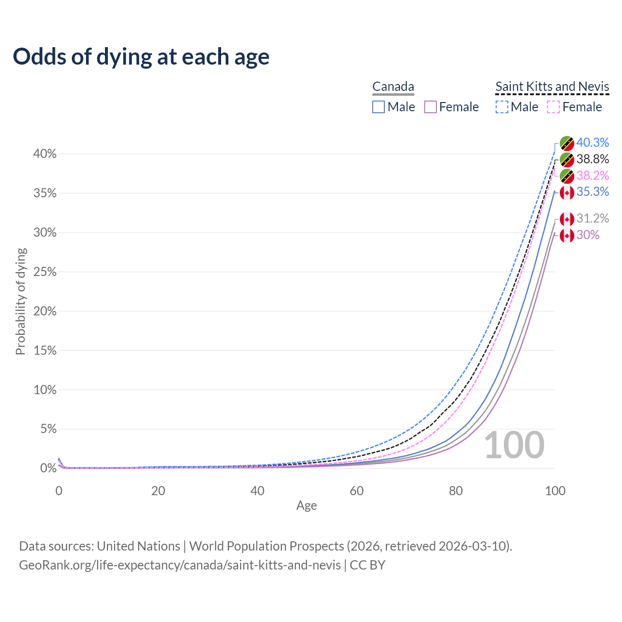 This life expectancy calculator shows the odds of living to 100, 95, 90, and below based on current age for both males and females in Canada and Saint Kitts and Nevis, along with mean and median age of death. The calculations are based on the 2026 life tables (actuarial tables) from the UN World Population Prospects.