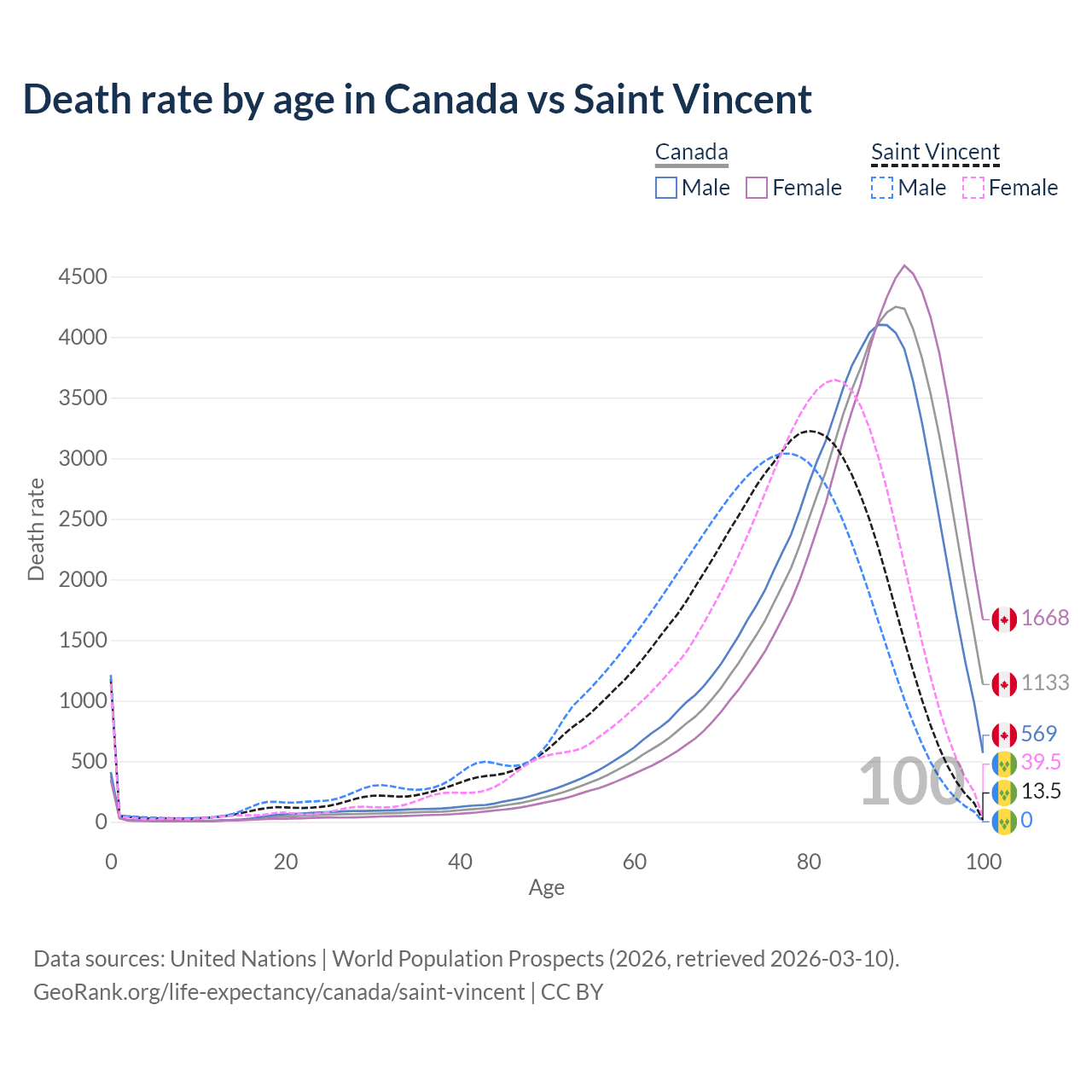 In Canada, the most common age of death is 90, compared to 80 in Saint Vincent. The median age of death is 86.4 in Canada and 75.6 in Saint Vincent, meaning only half of each cohort is expected to live past that age.