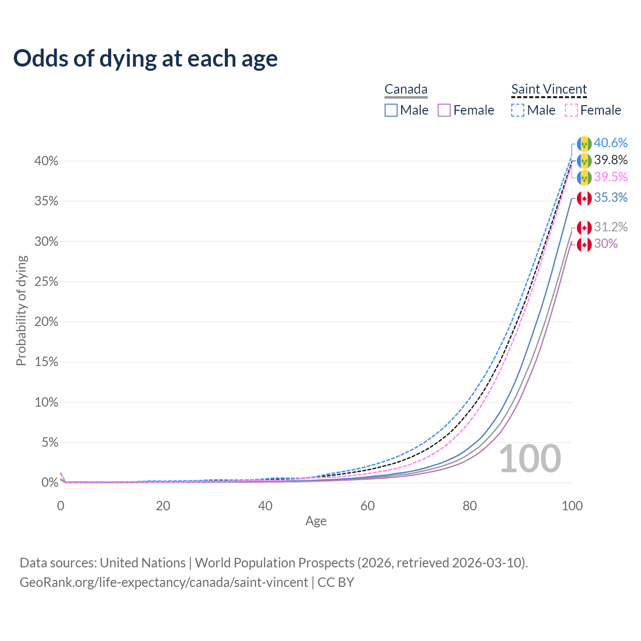 This life expectancy calculator shows the odds of living to 100, 95, 90, and below based on current age for both males and females in Canada and Saint Vincent, along with mean and median age of death. The calculations are based on the 2026 life tables (actuarial tables) from the UN World Population Prospects.