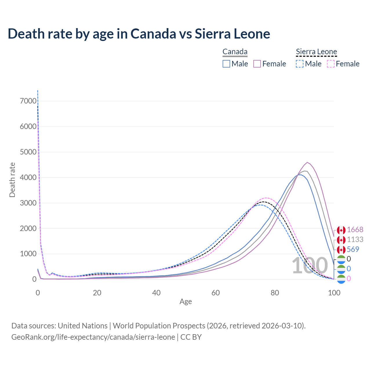 In Canada, the most common age of death is 90, compared to 0 in Sierra Leone. The median age of death is 86.4 in Canada and 70.8 in Sierra Leone, meaning only half of each cohort is expected to live past that age.