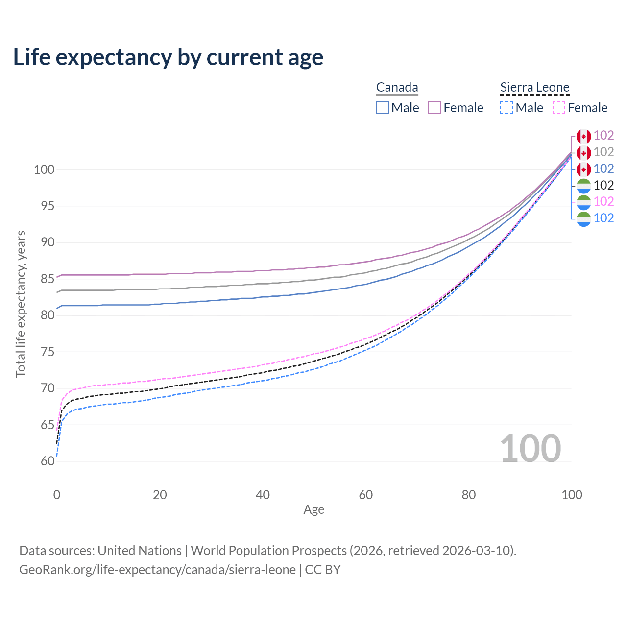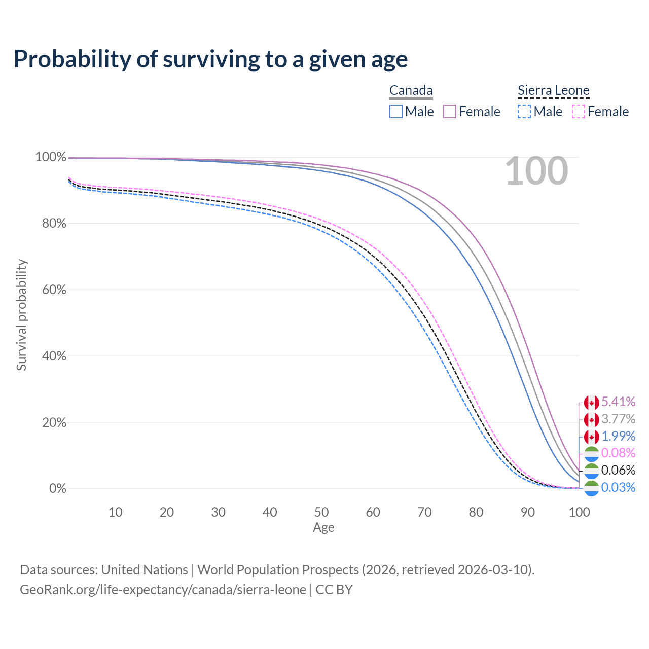 This life expectancy calculator shows the odds of living to 100, 95, 90, and below based on current age for both males and females in Canada and Sierra Leone, along with mean and median age of death. The calculations are based on the 2026 life tables (actuarial tables) from the UN World Population Prospects.