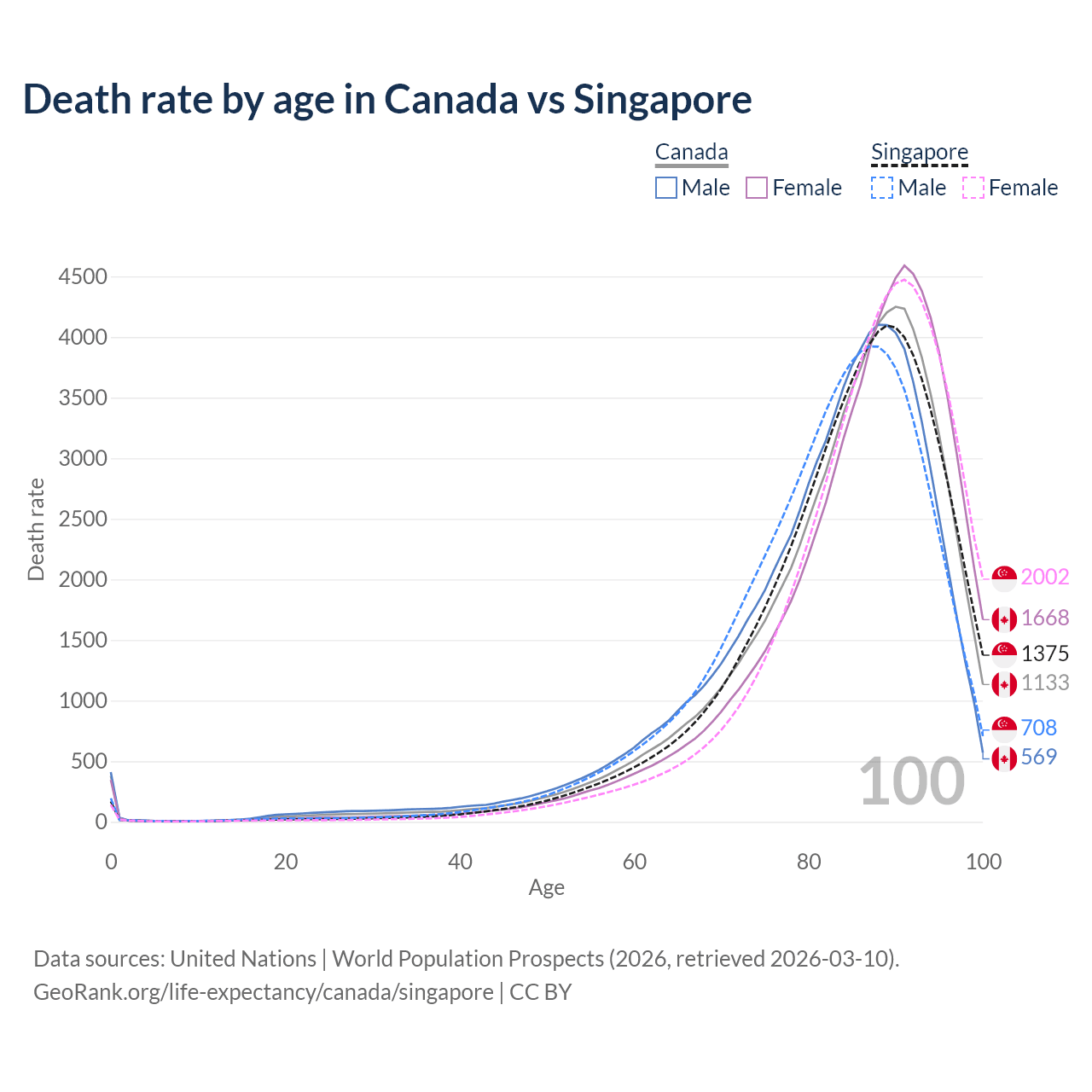 This life expectancy calculator shows the odds of living to 100, 95, 90, and below based on current age for both males and females in Canada and Singapore, along with mean and median age of death. The calculations are based on the 2026 life tables (actuarial tables) from the UN World Population Prospects.