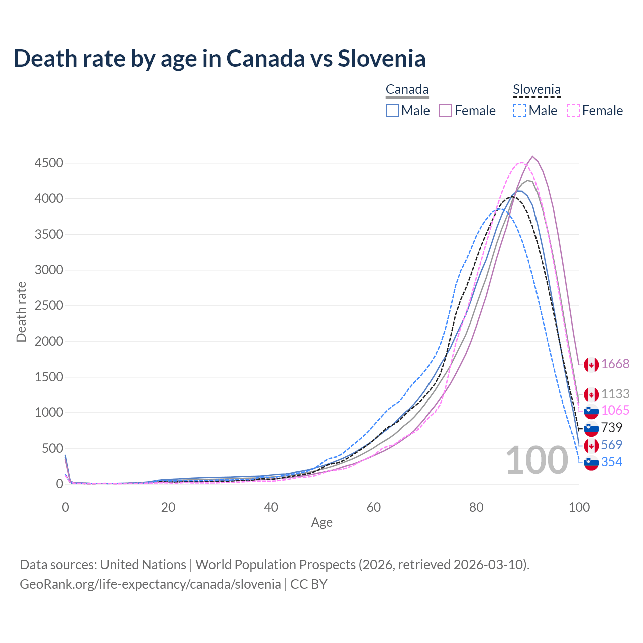 In Canada, the most common age of death is 90, compared to 87 in Slovenia. The median age of death is 86.4 in Canada and 84.4 in Slovenia, meaning only half of each cohort is expected to live past that age.
