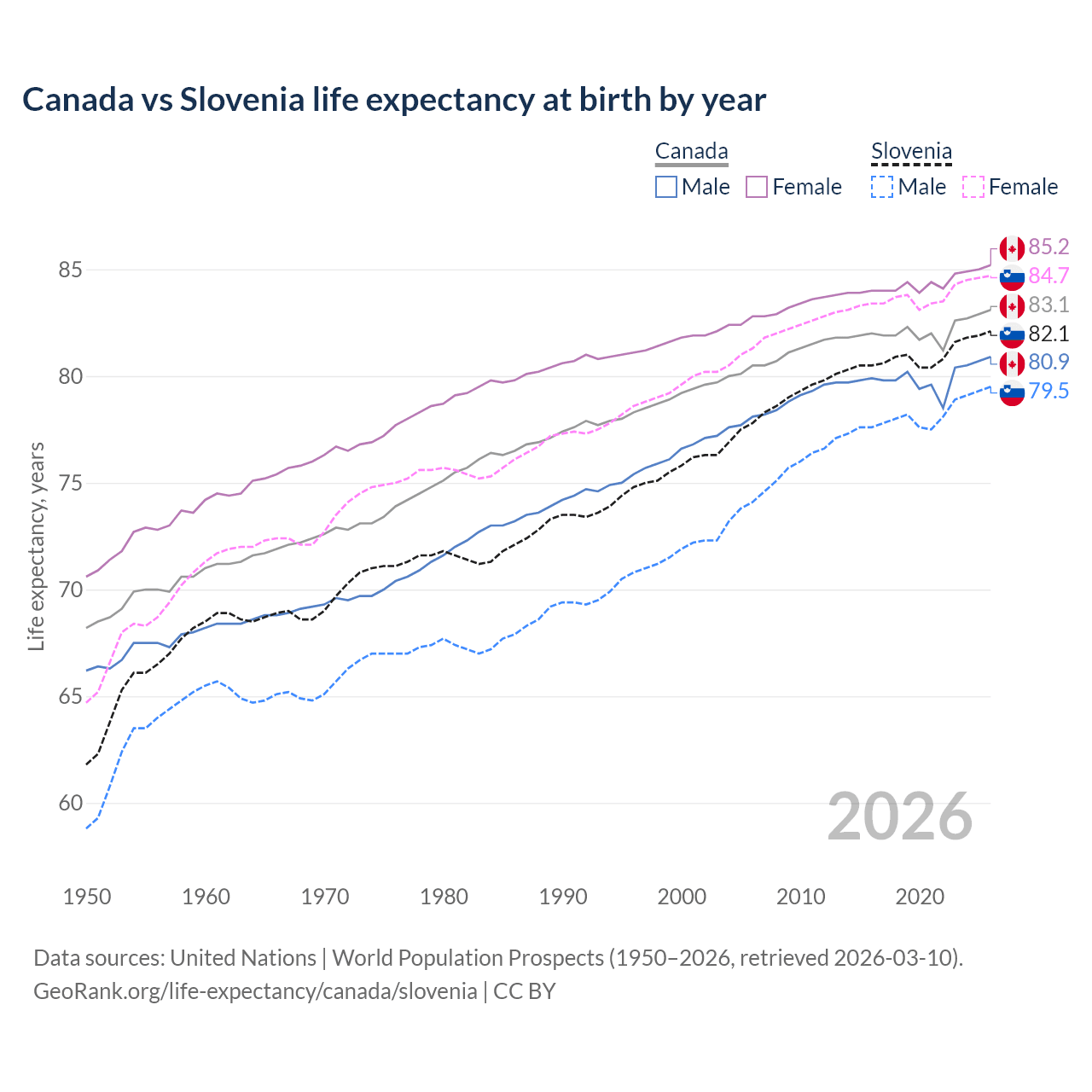 The average life expectancy at birth is 83.1 years in Canada vs 82.1 in Slovenia. Canada is ranked 19/197 by life expectancy, and Slovenia is 33/197. In Canada, the life expectancy is 80.9 years for males and 85.2 years for females. In Slovenia, it's 79.5 years for males and 84.7 years for females.