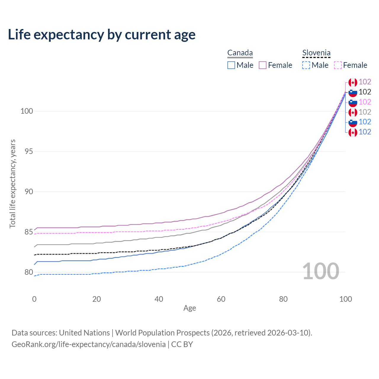 This life expectancy calculator shows the odds of living to 100, 95, 90, and below based on current age for both males and females in Canada and Slovenia, along with mean and median age of death. The calculations are based on the 2026 life tables (actuarial tables) from the UN World Population Prospects.