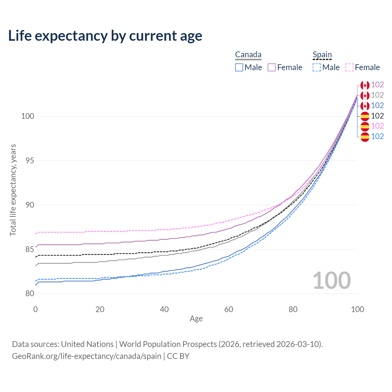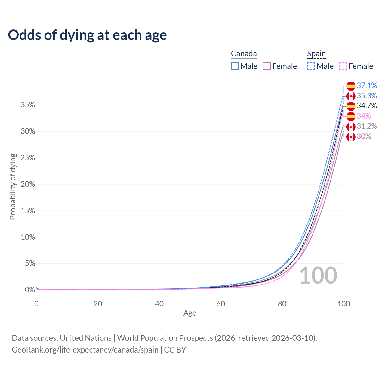 This life expectancy calculator shows the odds of living to 100, 95, 90, and below based on current age for both males and females in Canada and Spain, along with mean and median age of death. The calculations are based on the 2026 life tables (actuarial tables) from the UN World Population Prospects.