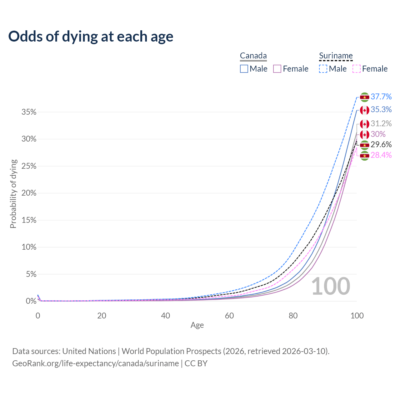 This life expectancy calculator shows the odds of living to 100, 95, 90, and below based on current age for both males and females in Canada and Suriname, along with mean and median age of death. The calculations are based on the 2026 life tables (actuarial tables) from the UN World Population Prospects.