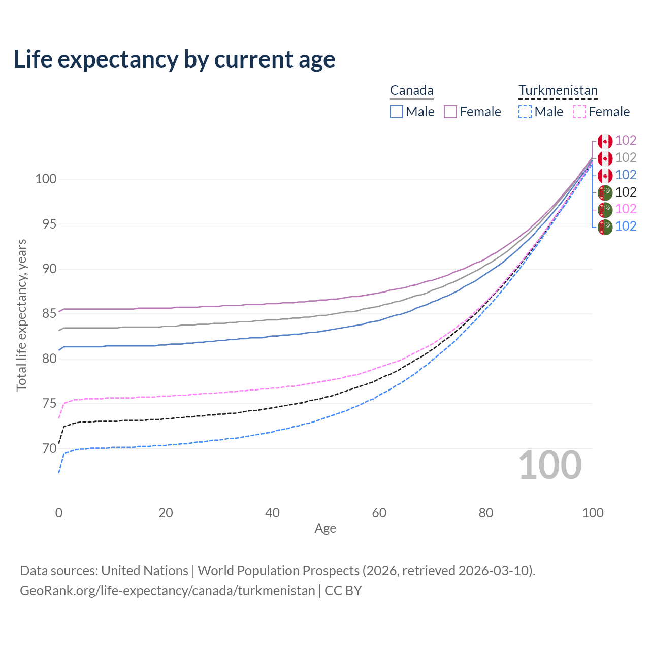 This life expectancy calculator shows the odds of living to 100, 95, 90, and below based on current age for both males and females in Canada and Turkmenistan, along with mean and median age of death. The calculations are based on the 2026 life tables (actuarial tables) from the UN World Population Prospects.