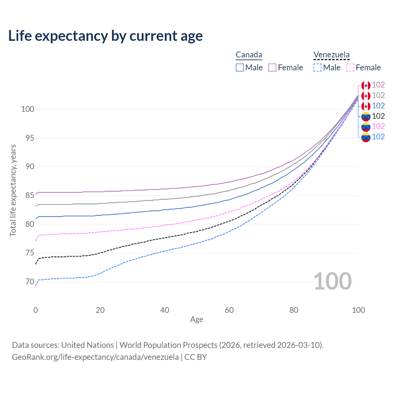 This life expectancy calculator shows the odds of living to 100, 95, 90, and below based on current age for both males and females in Canada and Venezuela, along with mean and median age of death. The calculations are based on the 2026 life tables (actuarial tables) from the UN World Population Prospects.