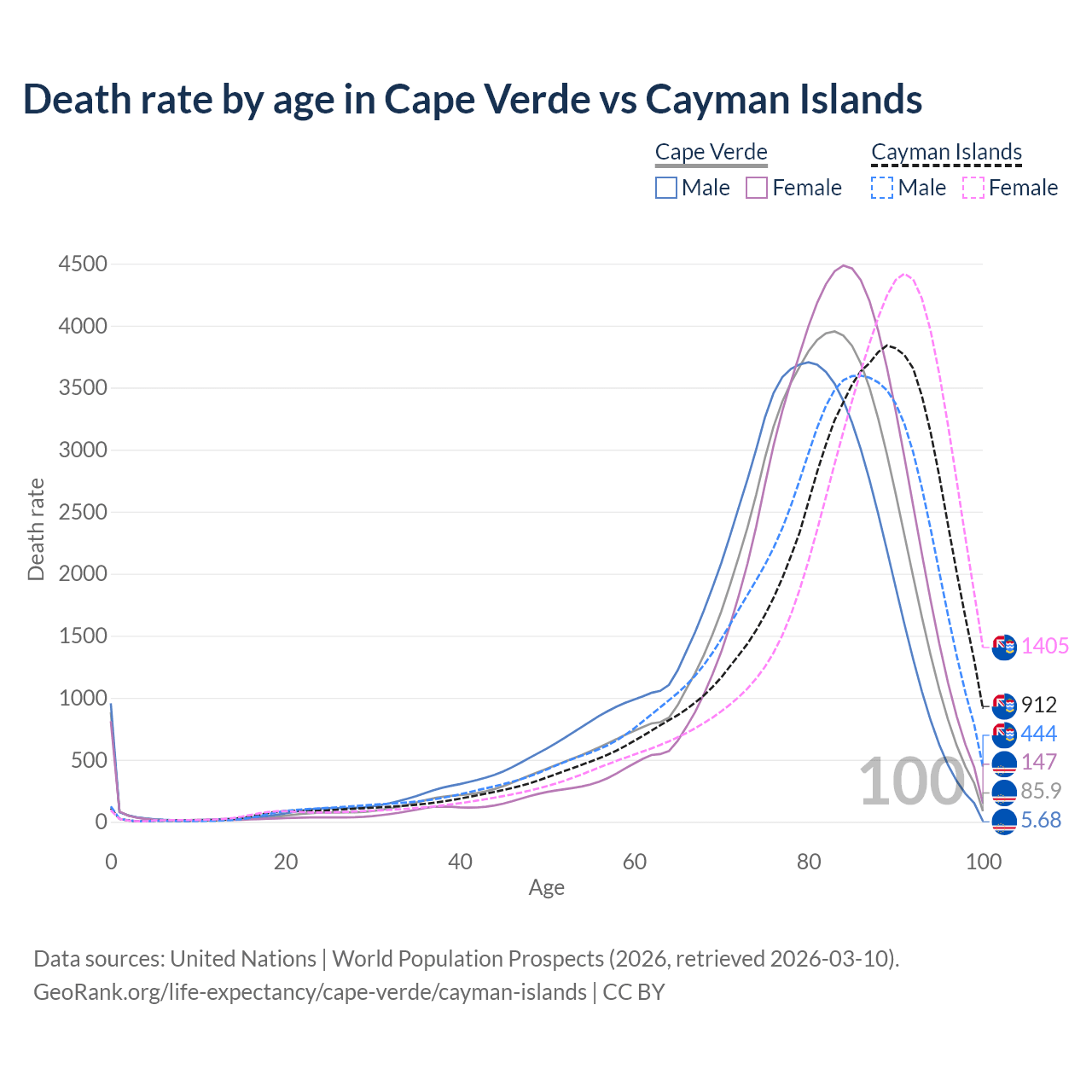 In Cape Verde, the most common age of death is 83, compared to 89 in the Cayman Islands. The median age of death is 80.1 in Cape Verde and 84.9 in the Cayman Islands, meaning only half of each cohort is expected to live past that age.