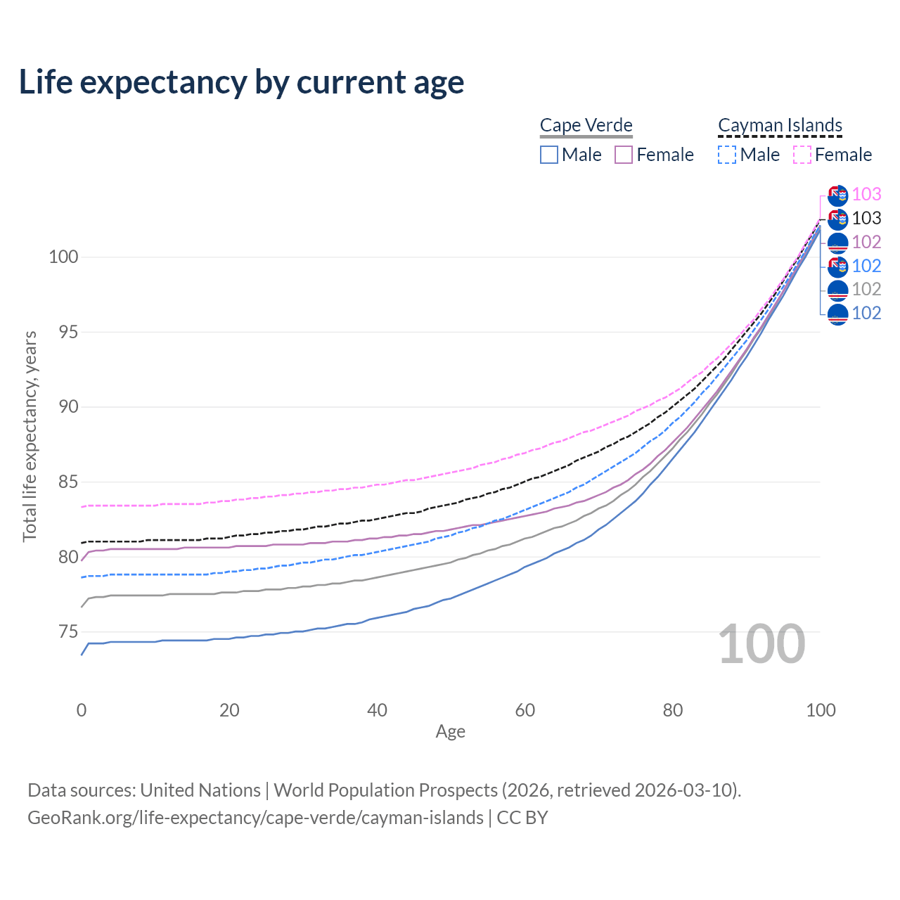 This life expectancy calculator shows the odds of living to 100, 95, 90, and below based on current age for both males and females in Cape Verde and the Cayman Islands, along with mean and median age of death. The calculations are based on the 2026 life tables (actuarial tables) from the UN World Population Prospects.