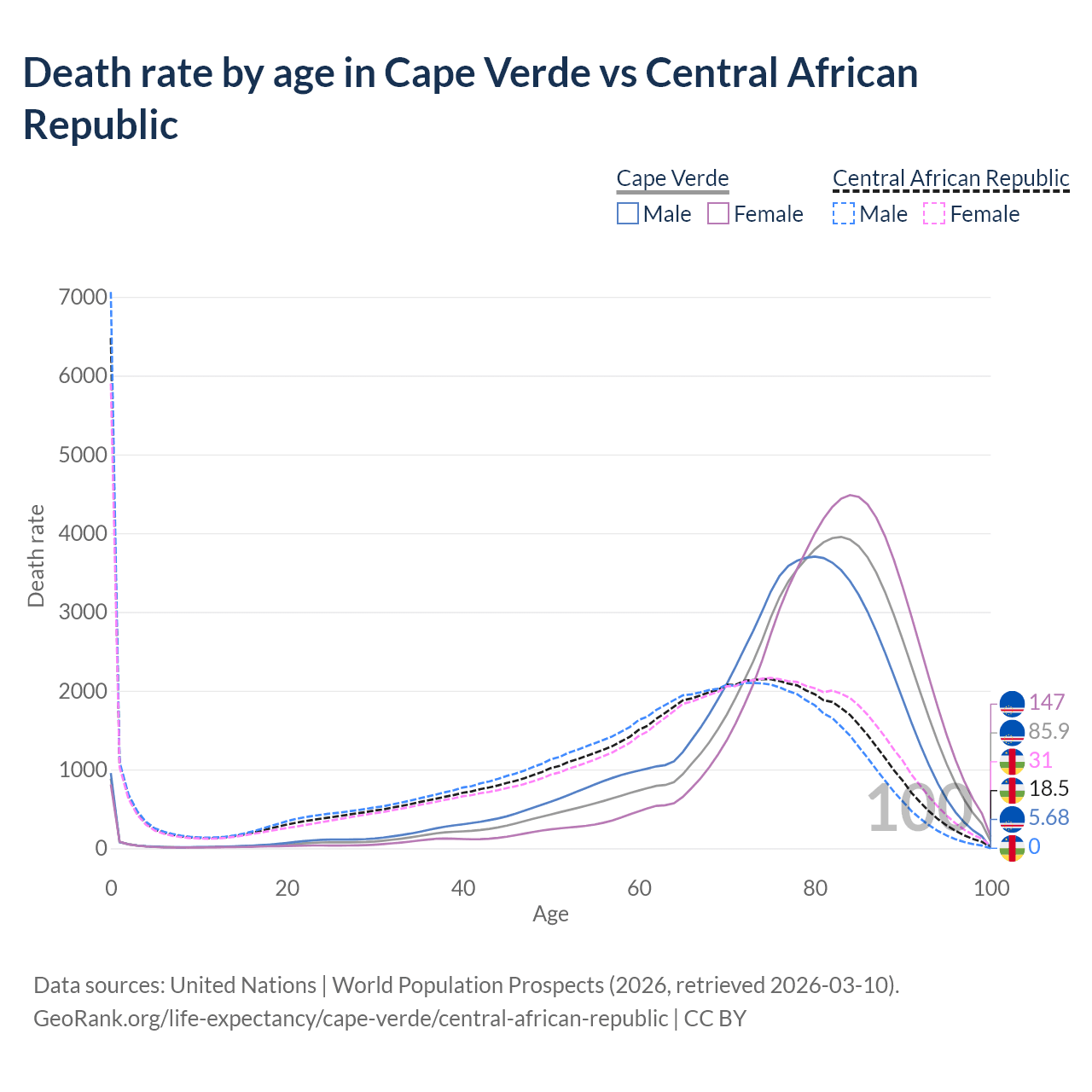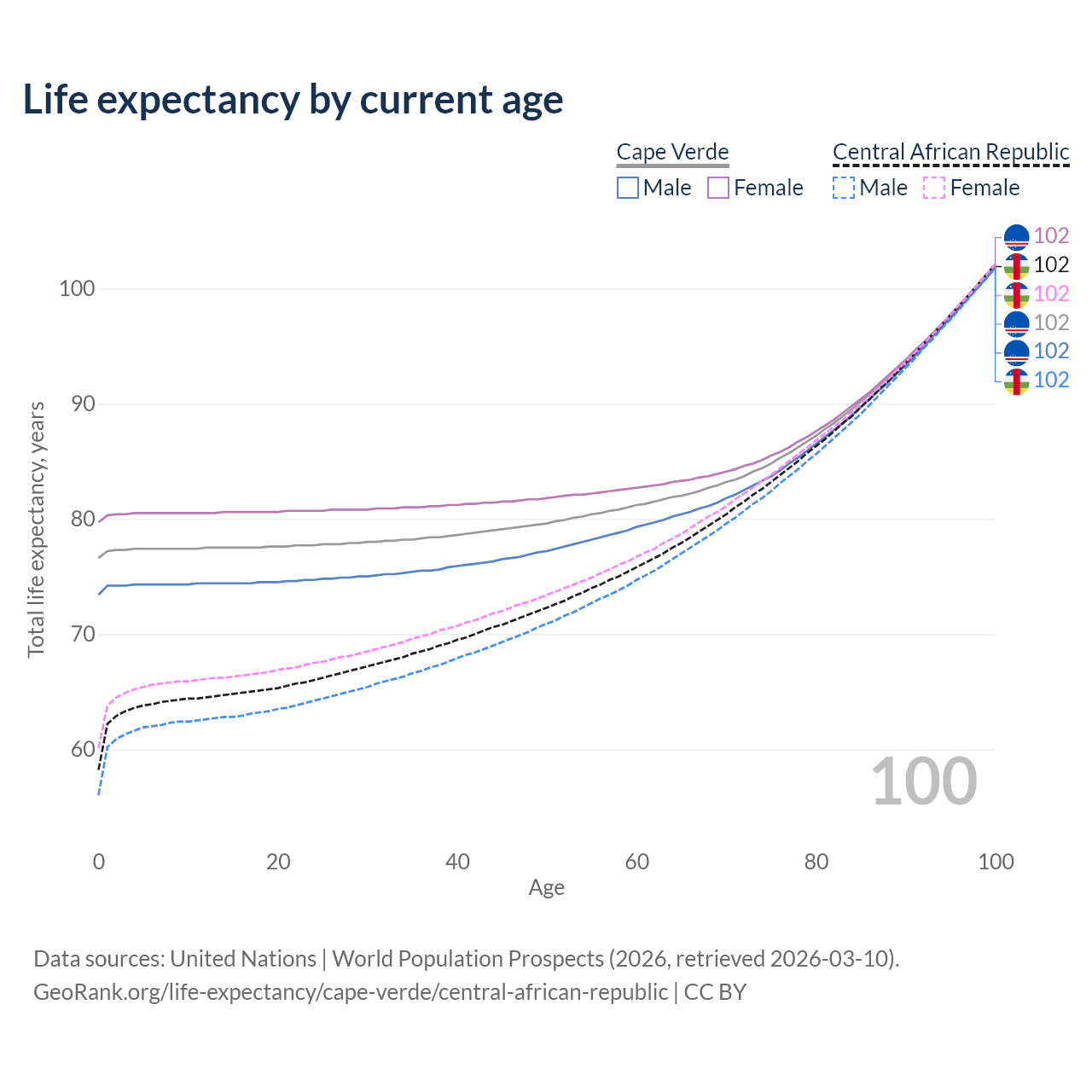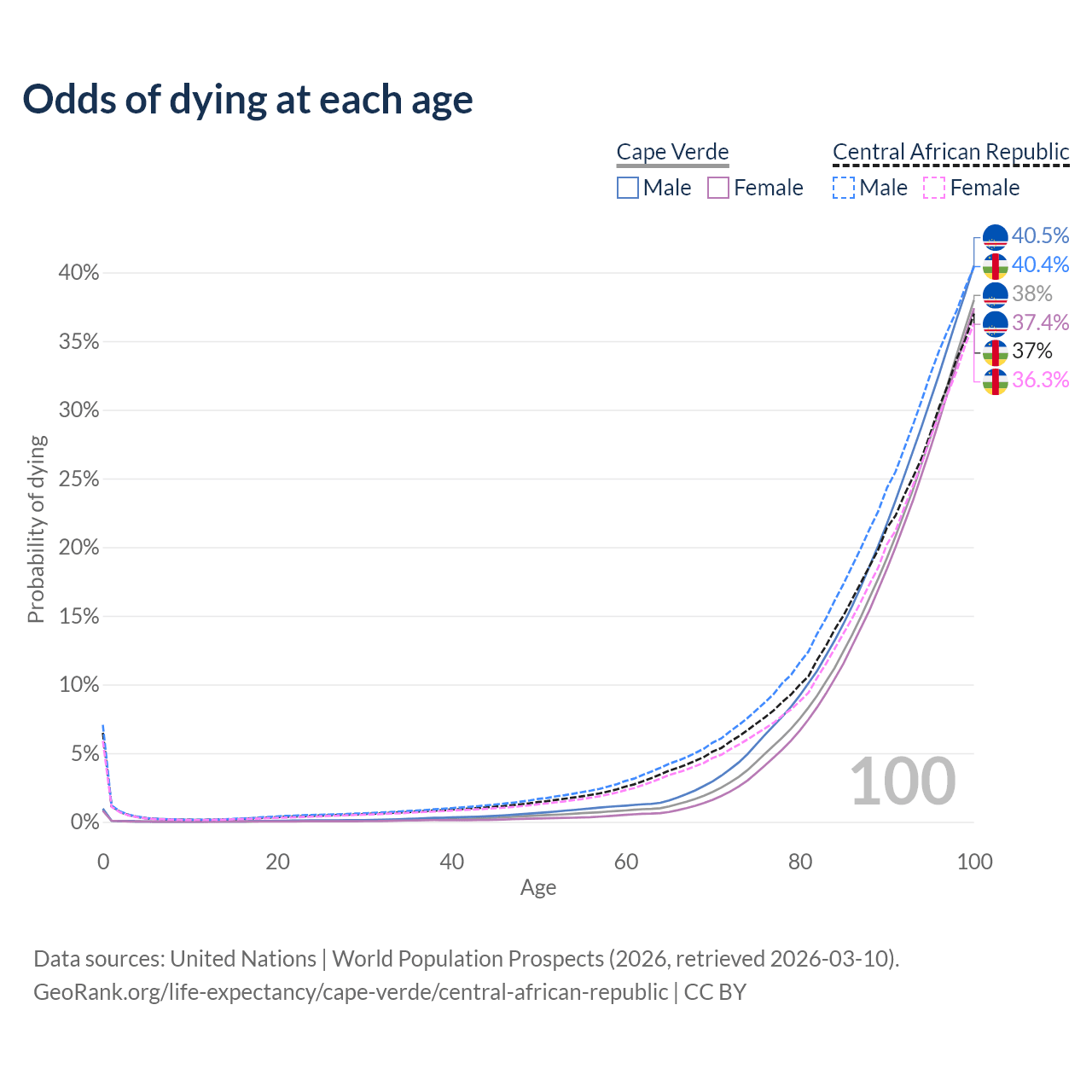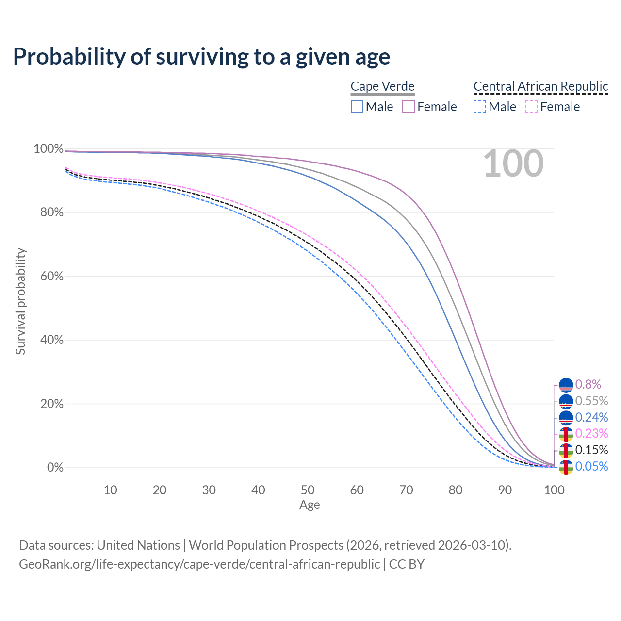 This life expectancy calculator shows the odds of living to 100, 95, 90, and below based on current age for both males and females in Cape Verde and the Central African Republic, along with mean and median age of death. The calculations are based on the 2026 life tables (actuarial tables) from the UN World Population Prospects.