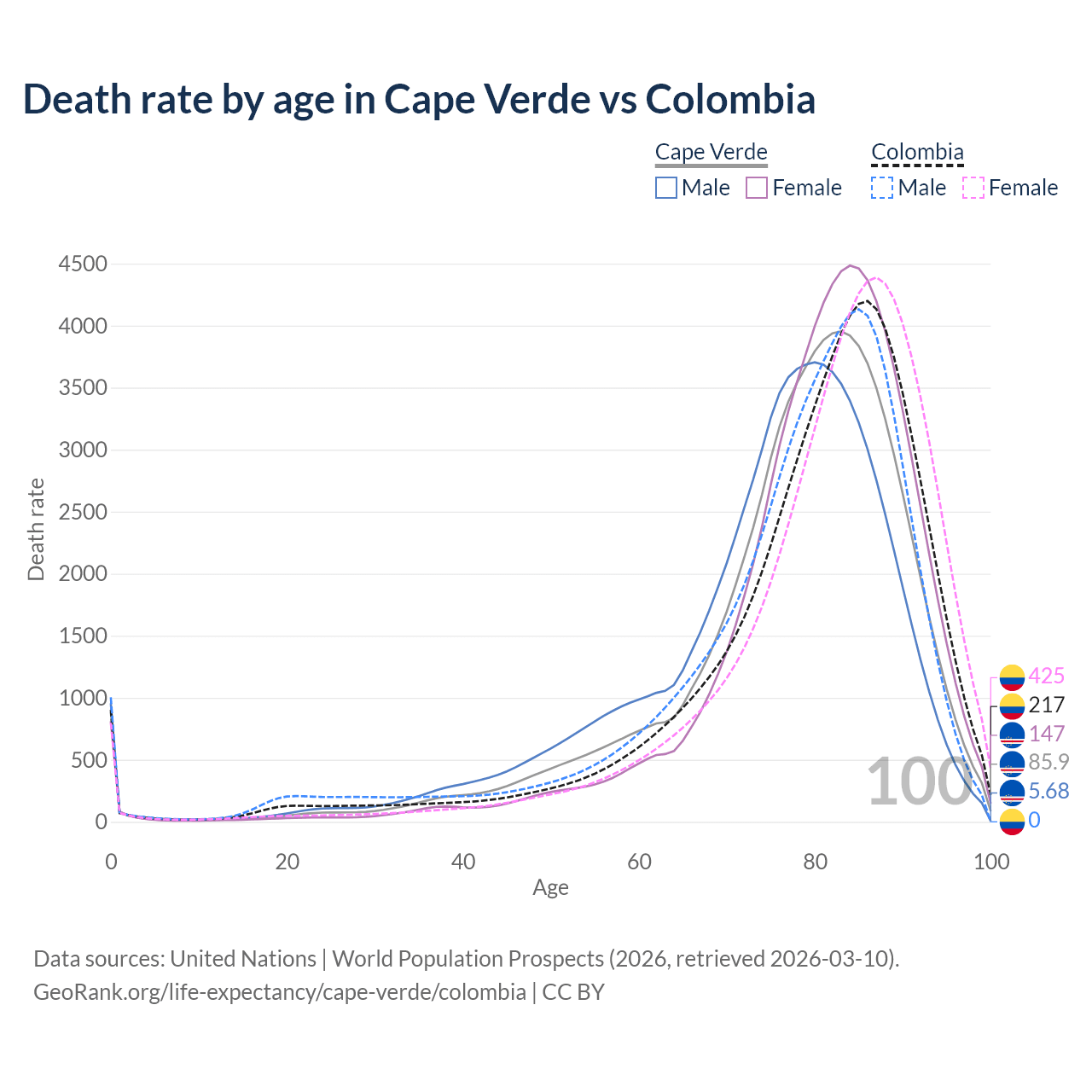 In Cape Verde, the most common age of death is 83, compared to 86 in Colombia. The median age of death is 80.1 in Cape Verde and 82.5 in Colombia, meaning only half of each cohort is expected to live past that age.