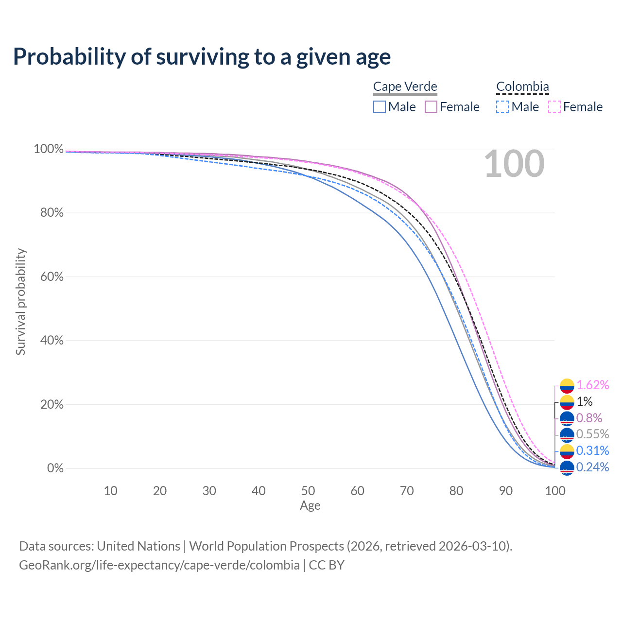 This life expectancy calculator shows the odds of living to 100, 95, 90, and below based on current age for both males and females in Cape Verde and Colombia, along with mean and median age of death. The calculations are based on the 2026 life tables (actuarial tables) from the UN World Population Prospects.