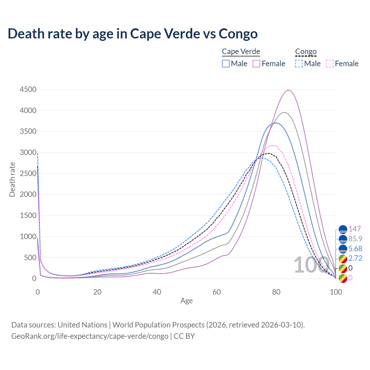 In Cape Verde, the most common age of death is 83, compared to 78 in the Congo. The median age of death is 80.1 in Cape Verde and 71.8 in the Congo, meaning only half of each cohort is expected to live past that age.