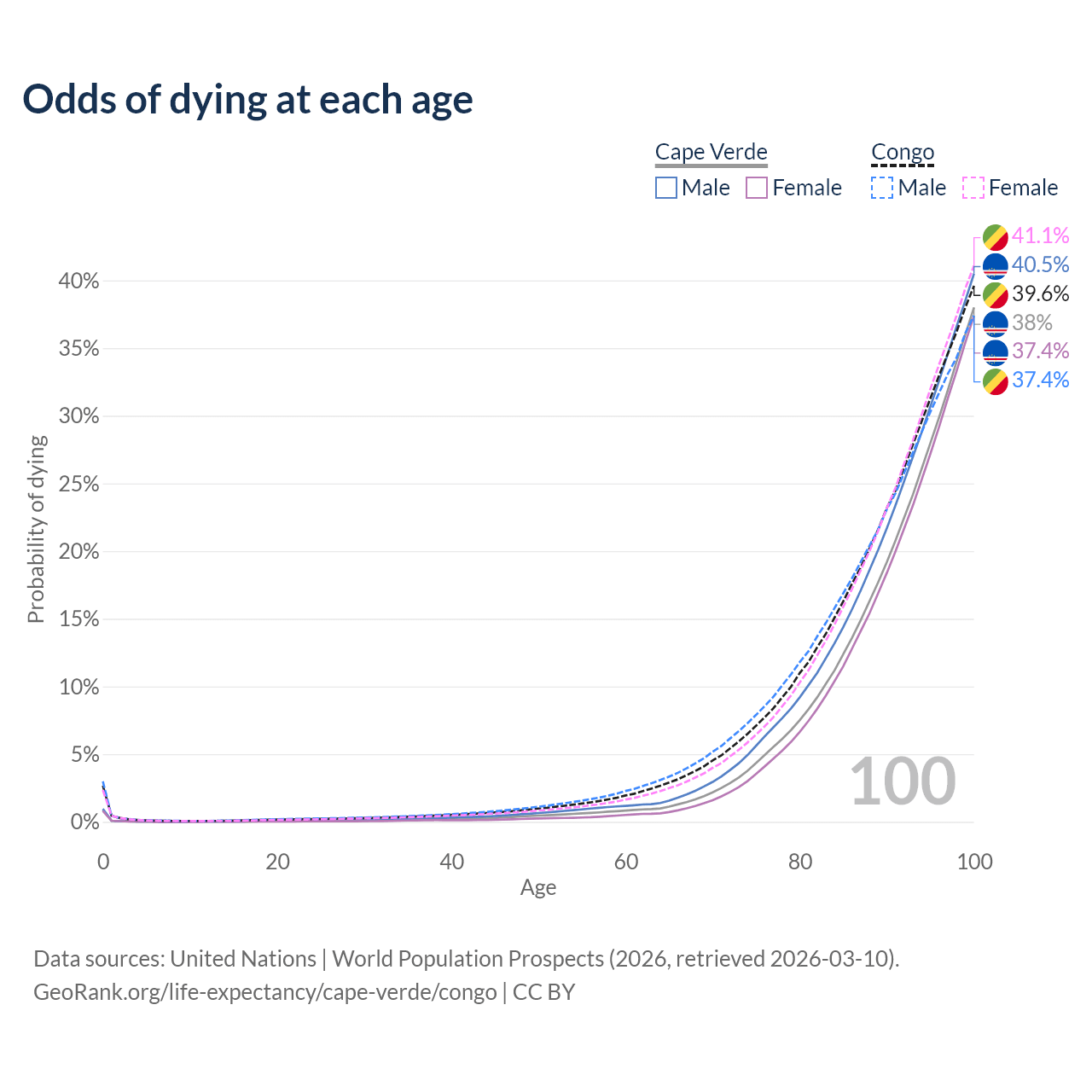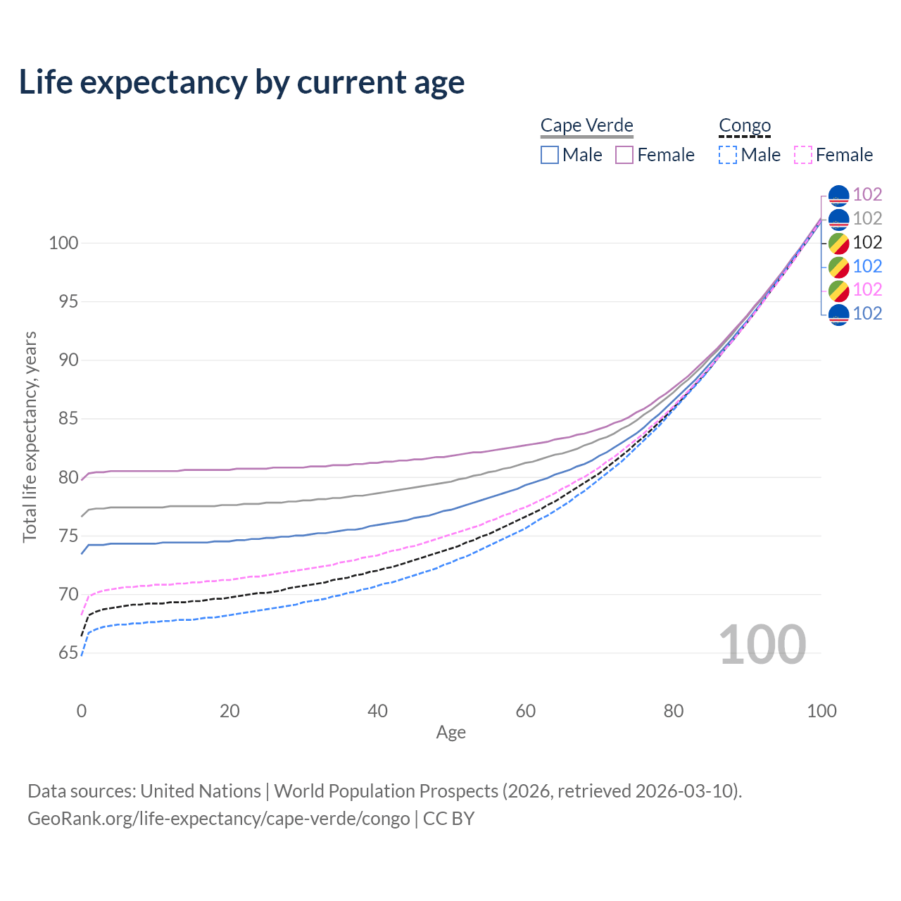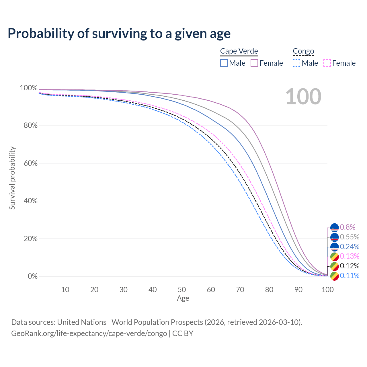 This life expectancy calculator shows the odds of living to 100, 95, 90, and below based on current age for both males and females in Cape Verde and the Congo, along with mean and median age of death. The calculations are based on the 2026 life tables (actuarial tables) from the UN World Population Prospects.