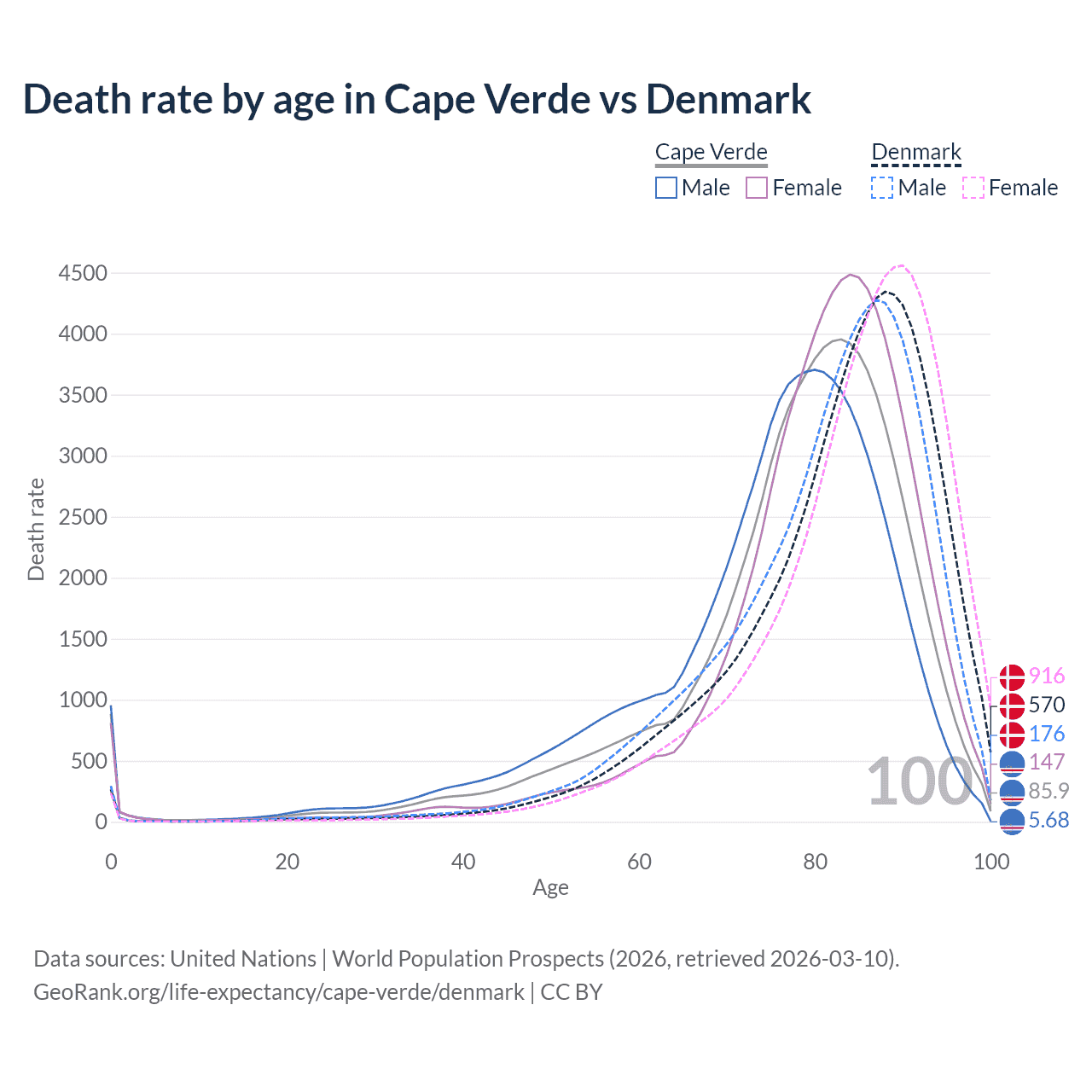 In Cape Verde, the most common age of death is 83, compared to 88 in Denmark. The median age of death is 80.1 in Cape Verde and 85.2 in Denmark, meaning only half of each cohort is expected to live past that age.