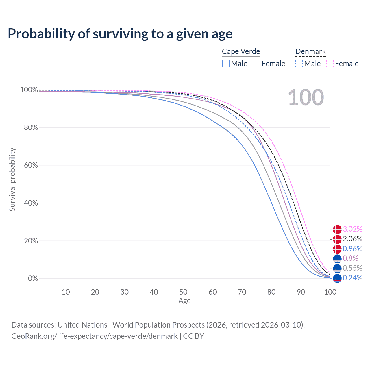 This life expectancy calculator shows the odds of living to 100, 95, 90, and below based on current age for both males and females in Cape Verde and Denmark, along with mean and median age of death. The calculations are based on the 2026 life tables (actuarial tables) from the UN World Population Prospects.