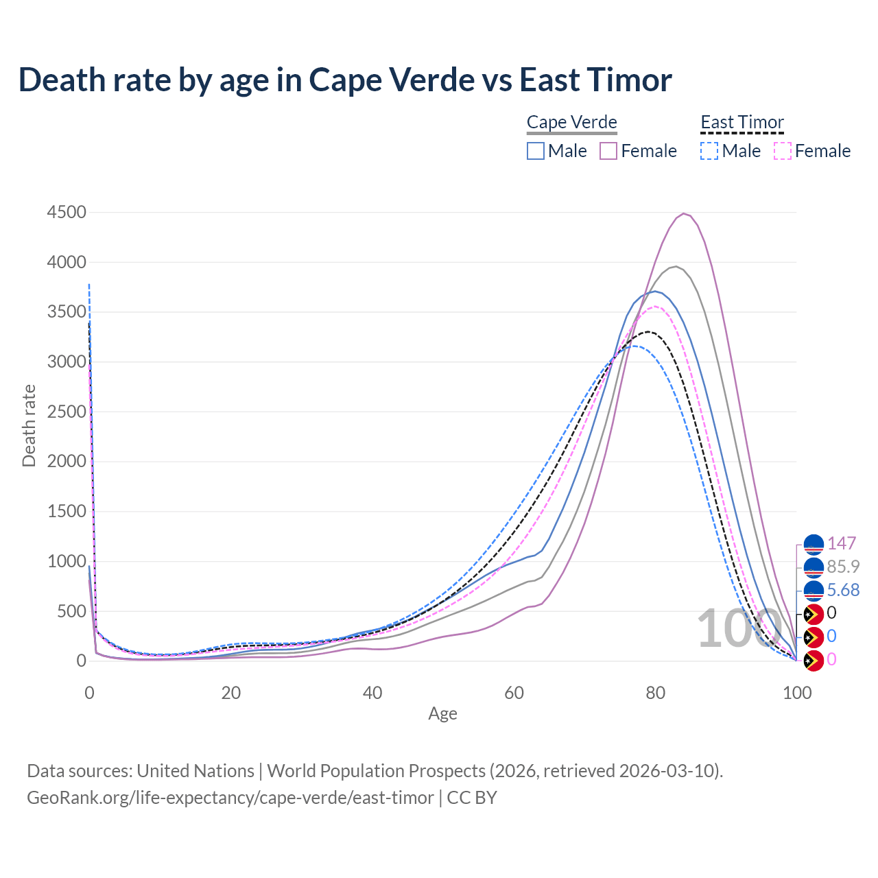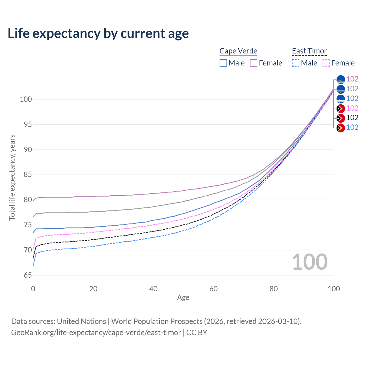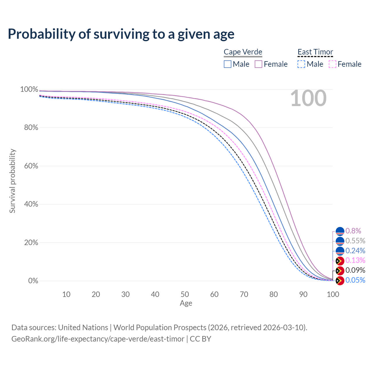 This life expectancy calculator shows the odds of living to 100, 95, 90, and below based on current age for both males and females in Cape Verde and East Timor, along with mean and median age of death. The calculations are based on the 2026 life tables (actuarial tables) from the UN World Population Prospects.