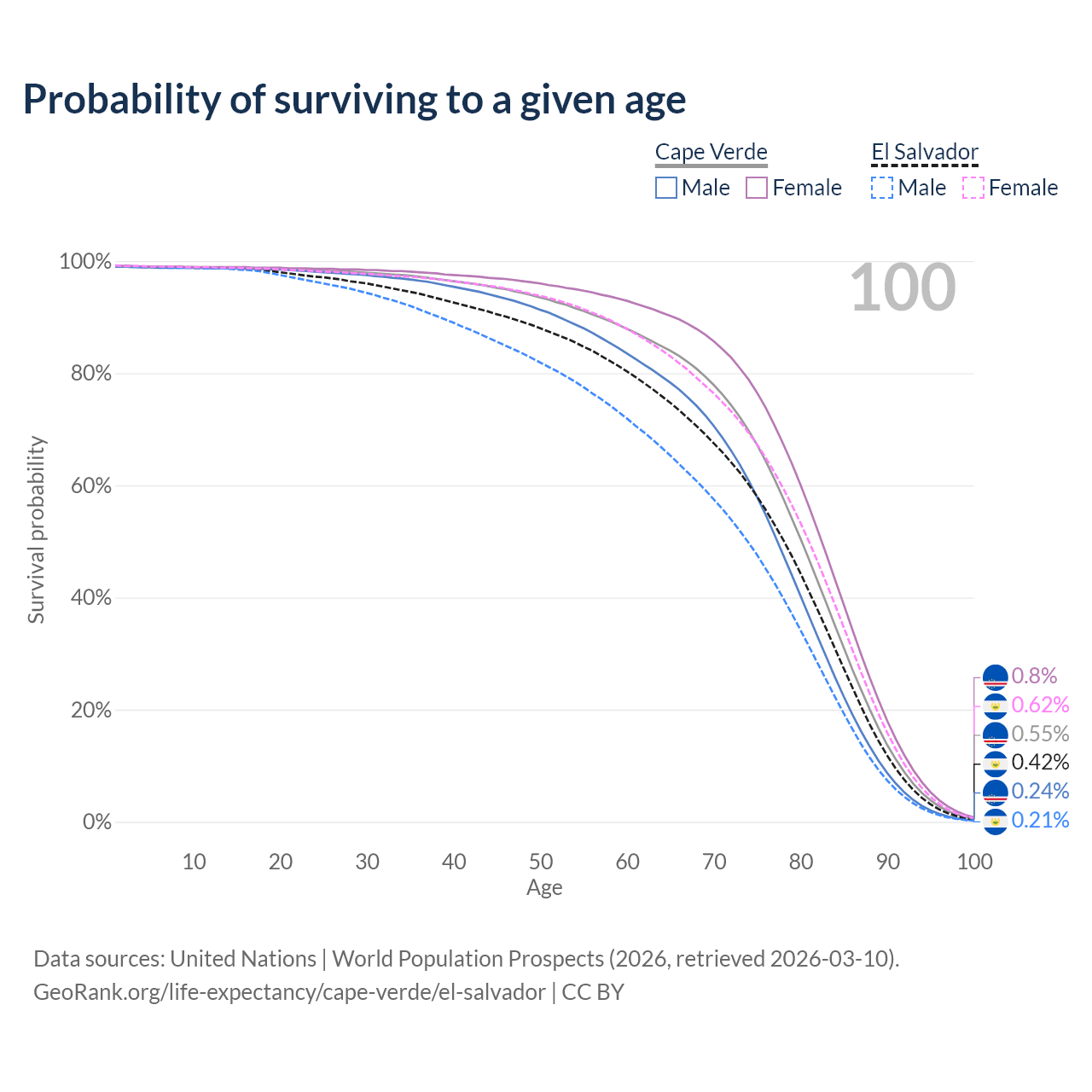 This life expectancy calculator shows the odds of living to 100, 95, 90, and below based on current age for both males and females in Cape Verde and El Salvador, along with mean and median age of death. The calculations are based on the 2026 life tables (actuarial tables) from the UN World Population Prospects.