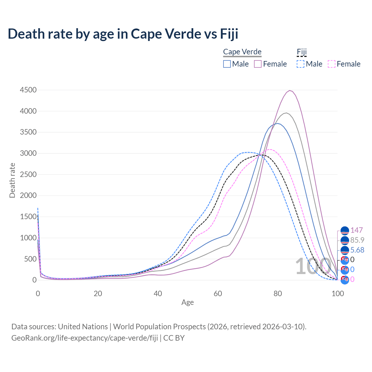 In Cape Verde, the most common age of death is 83, compared to 74 in Fiji. The median age of death is 80.1 in Cape Verde and 70.5 in Fiji, meaning only half of each cohort is expected to live past that age.