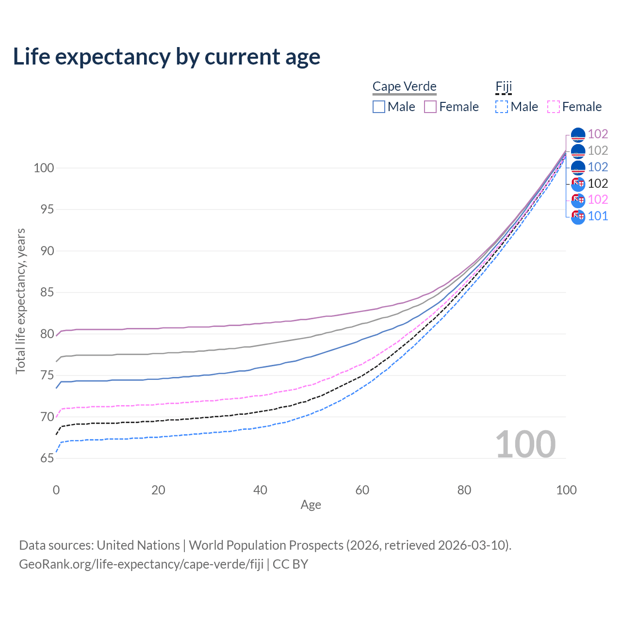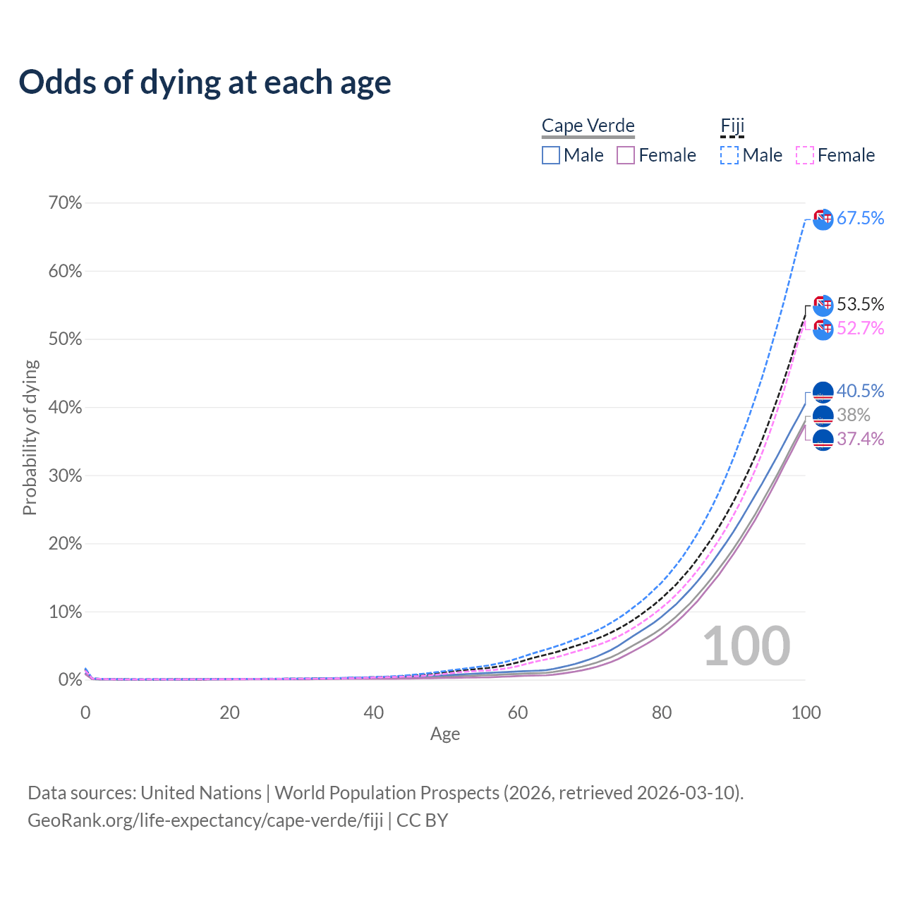 This life expectancy calculator shows the odds of living to 100, 95, 90, and below based on current age for both males and females in Cape Verde and Fiji, along with mean and median age of death. The calculations are based on the 2026 life tables (actuarial tables) from the UN World Population Prospects.