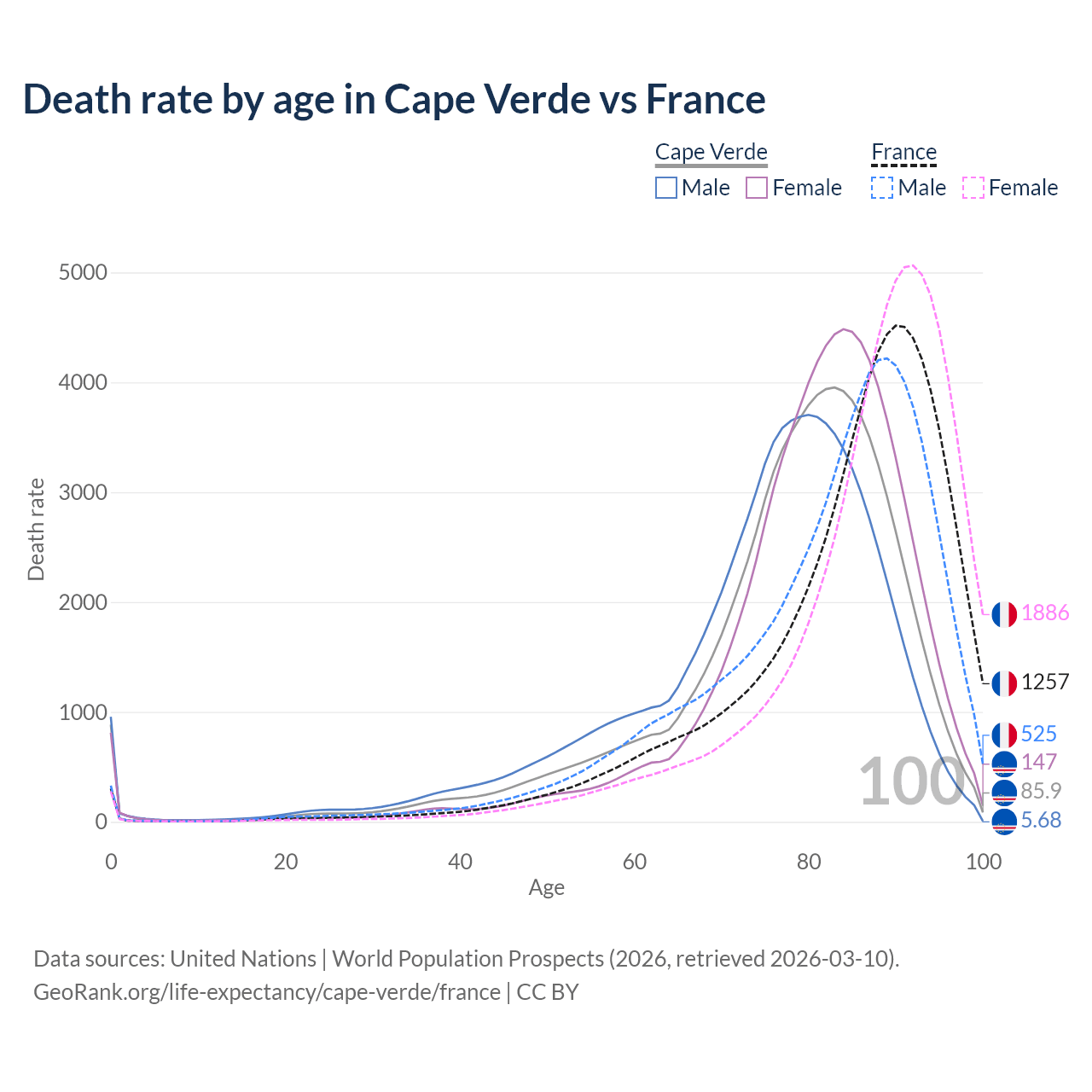 In Cape Verde, the most common age of death is 83, compared to 90 in France. The median age of death is 80.1 in Cape Verde and 87.4 in France, meaning only half of each cohort is expected to live past that age.