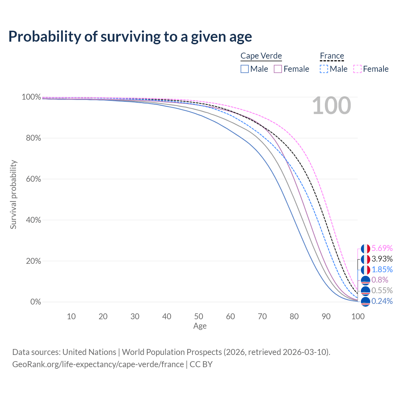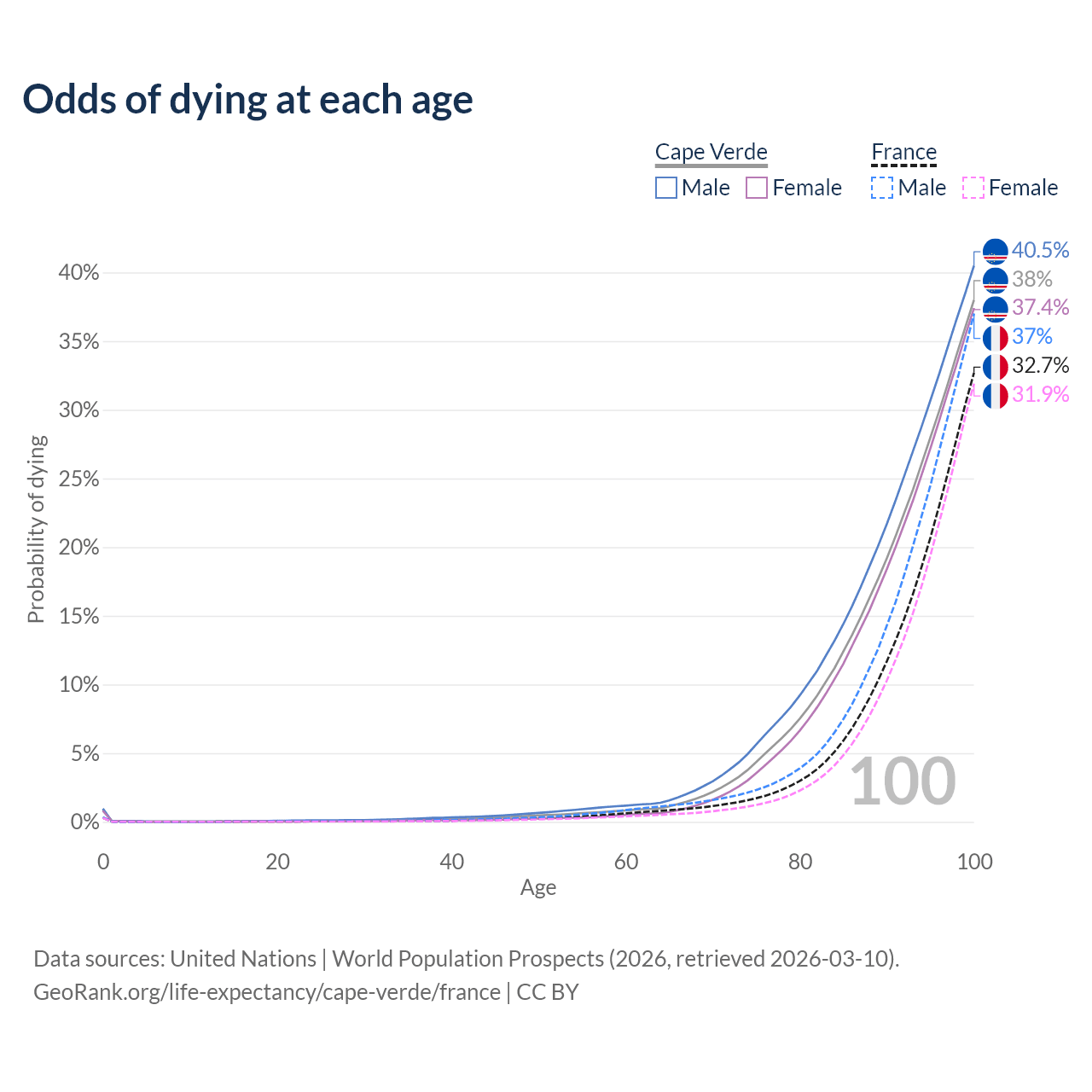 This life expectancy calculator shows the odds of living to 100, 95, 90, and below based on current age for both males and females in Cape Verde and France, along with mean and median age of death. The calculations are based on the 2026 life tables (actuarial tables) from the UN World Population Prospects.