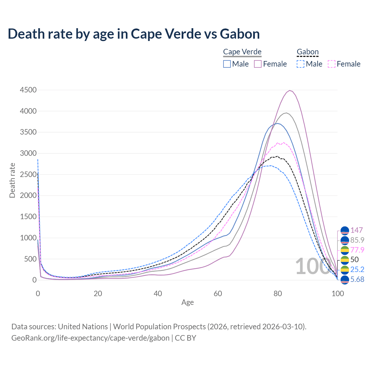 In Cape Verde, the most common age of death is 83, compared to 80 in Gabon. The median age of death is 80.1 in Cape Verde and 73.9 in Gabon, meaning only half of each cohort is expected to live past that age.