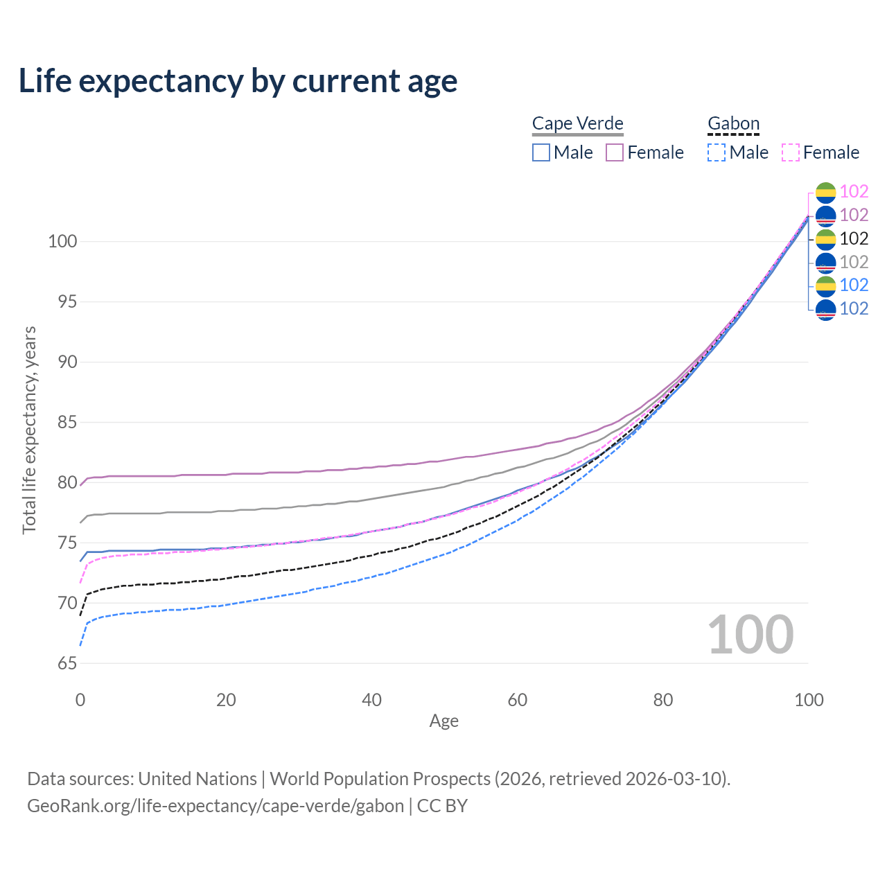 This life expectancy calculator shows the odds of living to 100, 95, 90, and below based on current age for both males and females in Cape Verde and Gabon, along with mean and median age of death. The calculations are based on the 2026 life tables (actuarial tables) from the UN World Population Prospects.