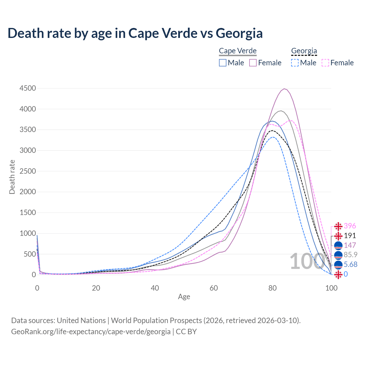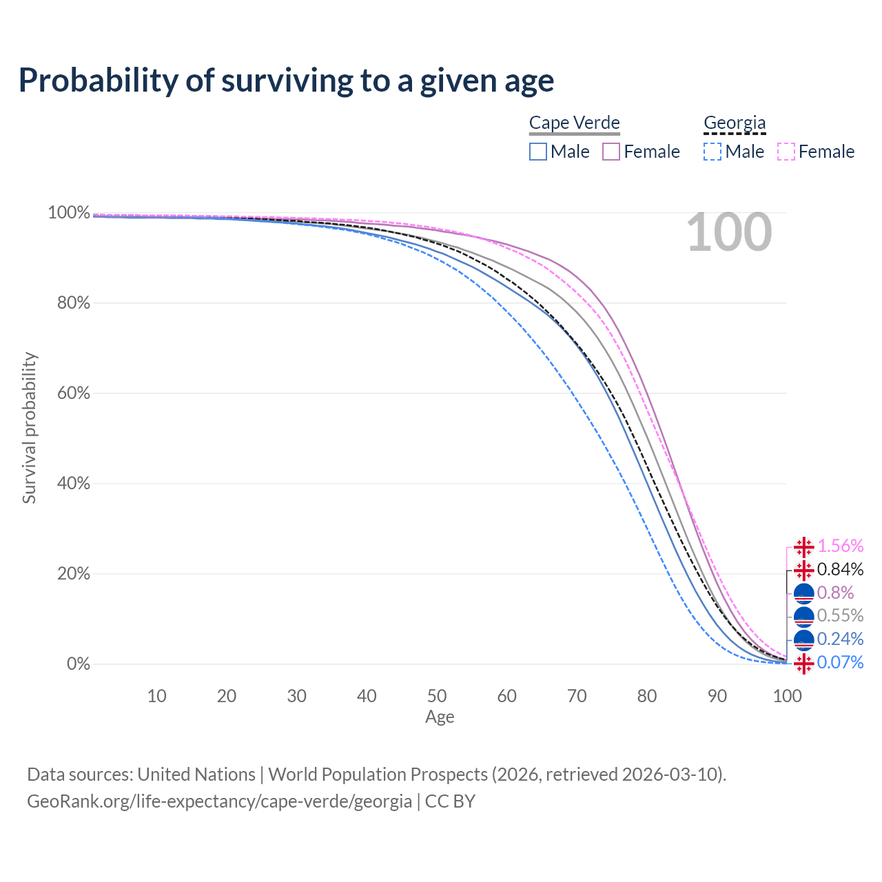 This life expectancy calculator shows the odds of living to 100, 95, 90, and below based on current age for both males and females in Cape Verde and Georgia, along with mean and median age of death. The calculations are based on the 2026 life tables (actuarial tables) from the UN World Population Prospects.
