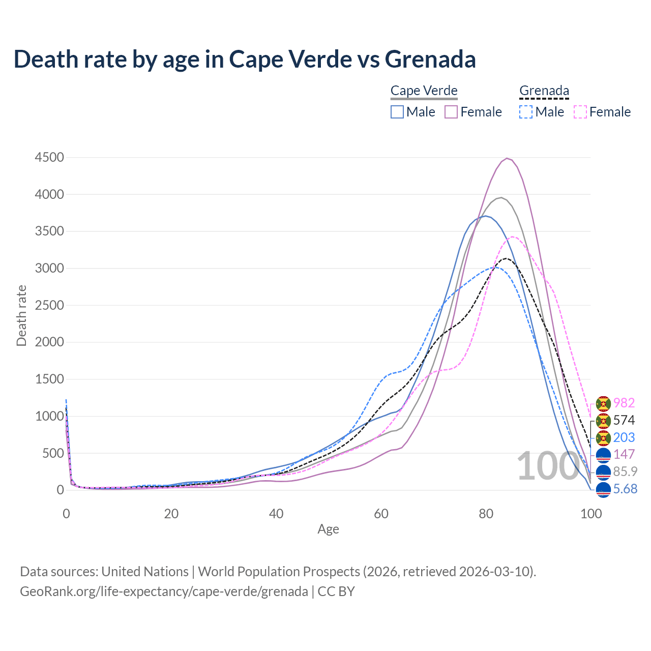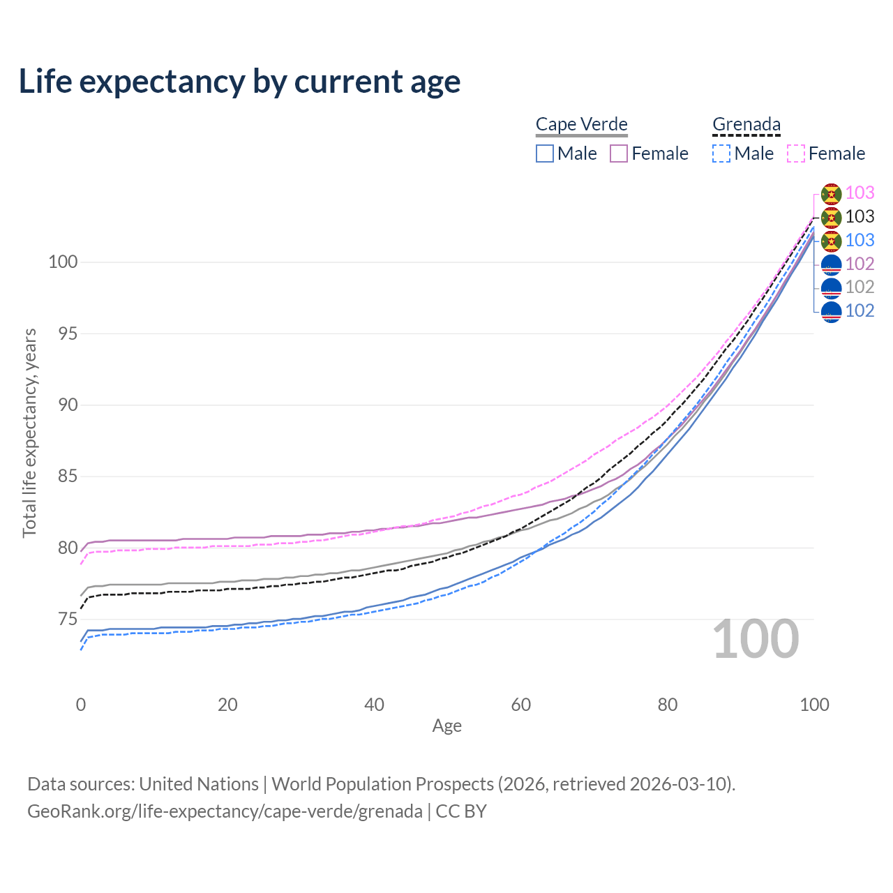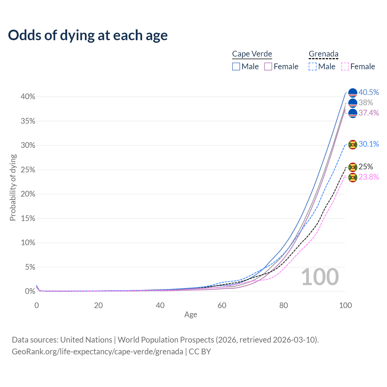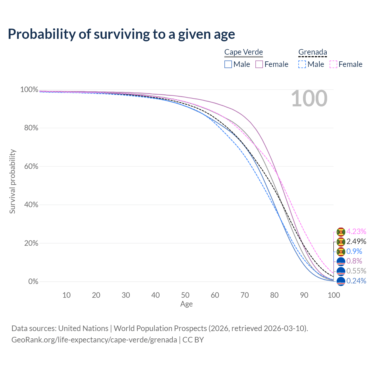 This life expectancy calculator shows the odds of living to 100, 95, 90, and below based on current age for both males and females in Cape Verde and Grenada, along with mean and median age of death. The calculations are based on the 2026 life tables (actuarial tables) from the UN World Population Prospects.