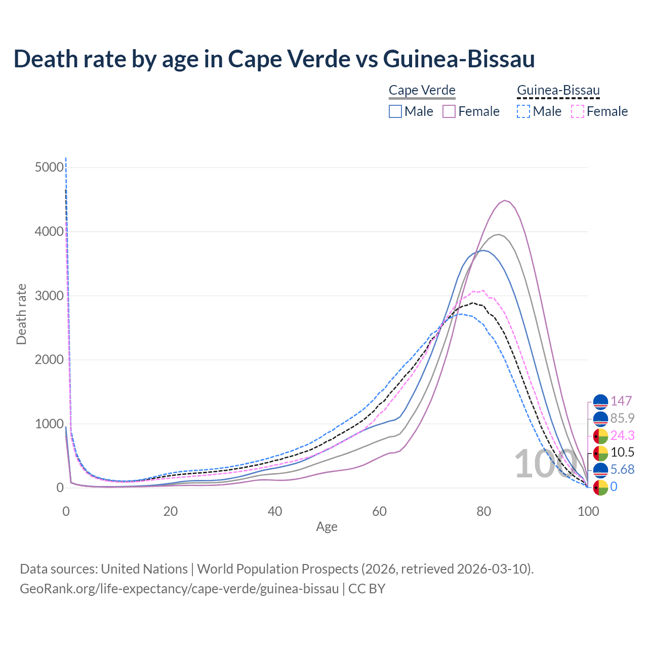 In Cape Verde, the most common age of death is 83, compared to 0 in Guinea-Bissau. The median age of death is 80.1 in Cape Verde and 71.8 in Guinea-Bissau, meaning only half of each cohort is expected to live past that age.