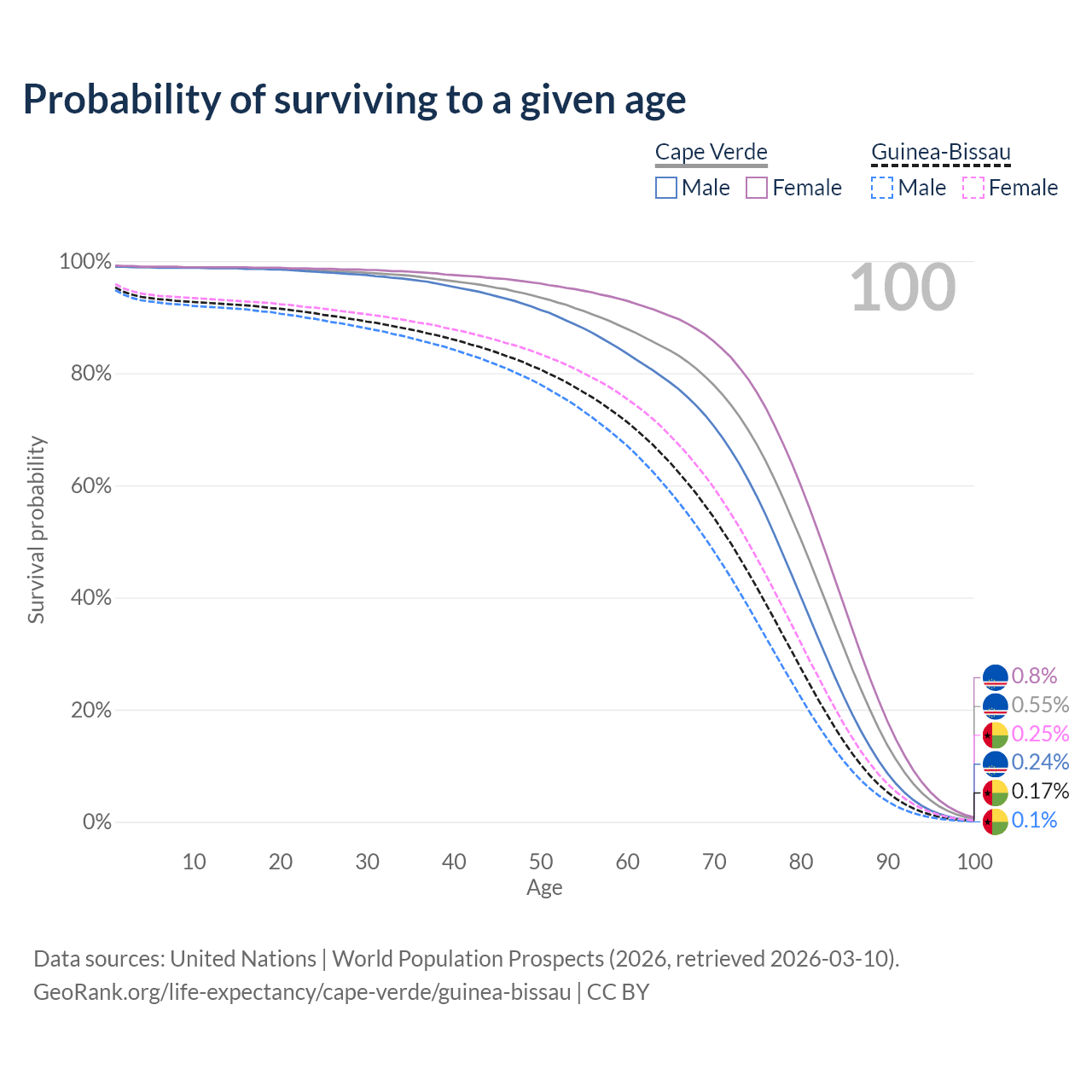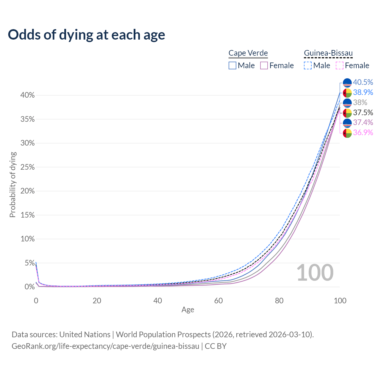 This life expectancy calculator shows the odds of living to 100, 95, 90, and below based on current age for both males and females in Cape Verde and Guinea-Bissau, along with mean and median age of death. The calculations are based on the 2026 life tables (actuarial tables) from the UN World Population Prospects.