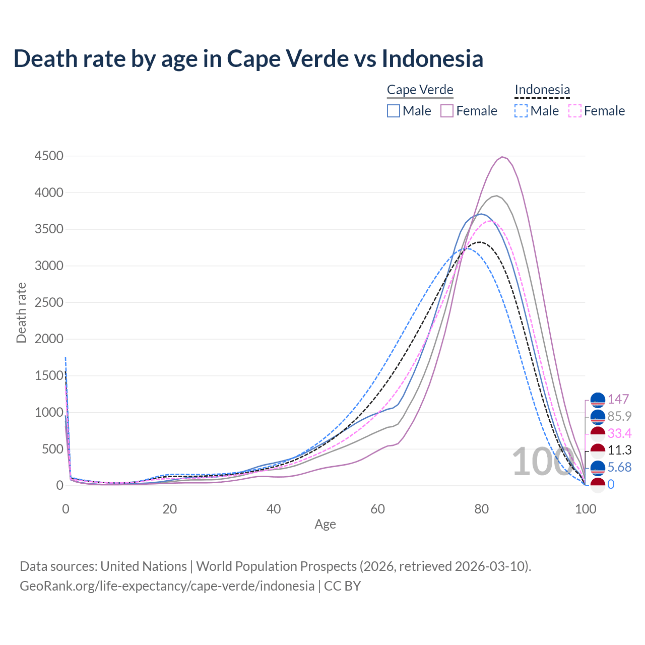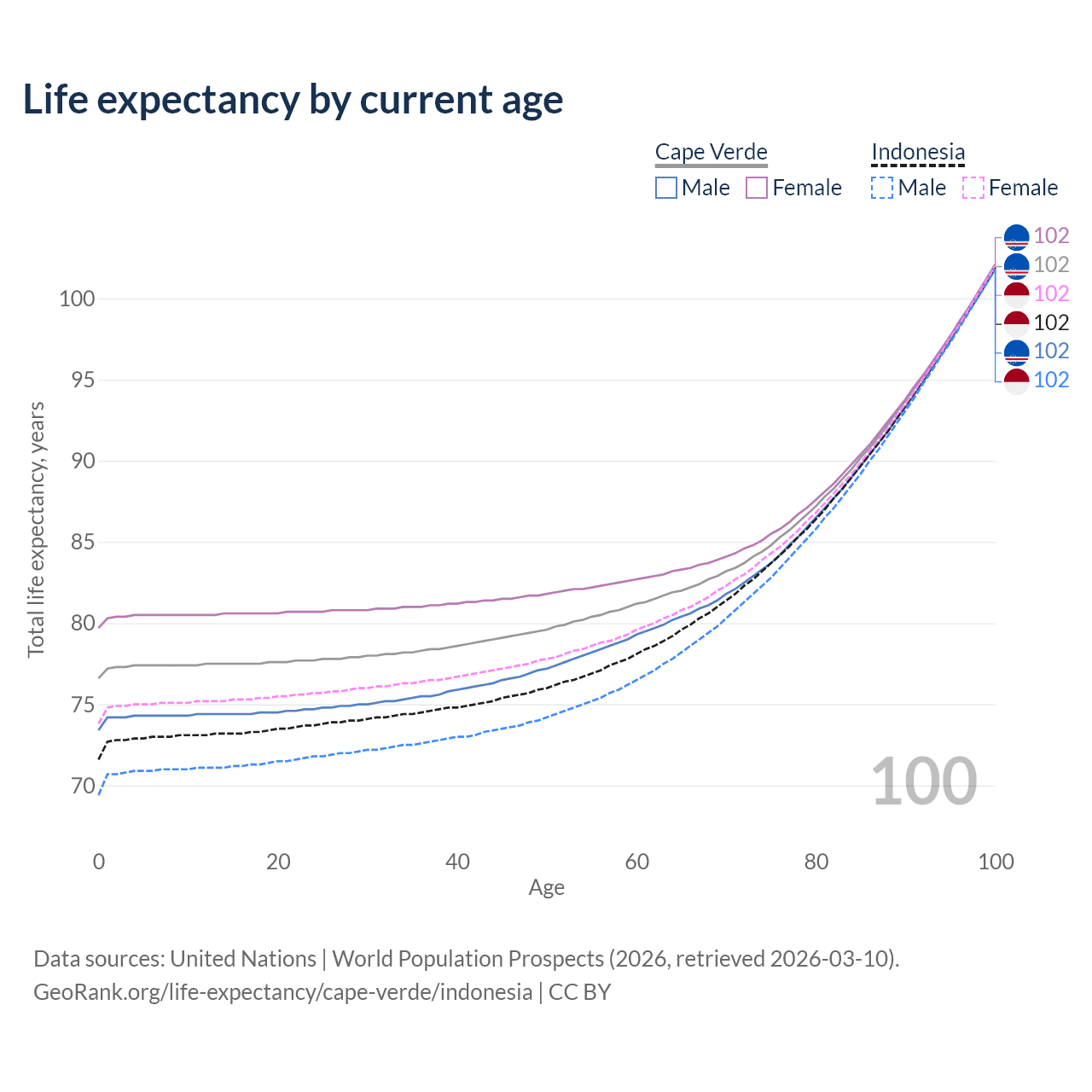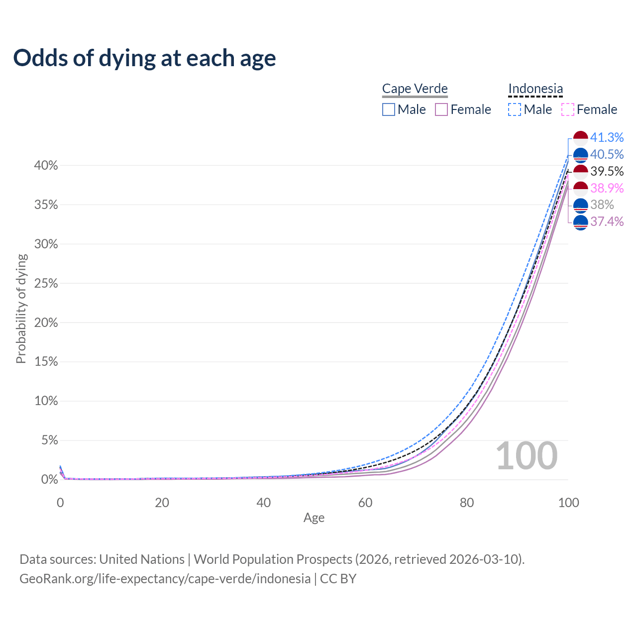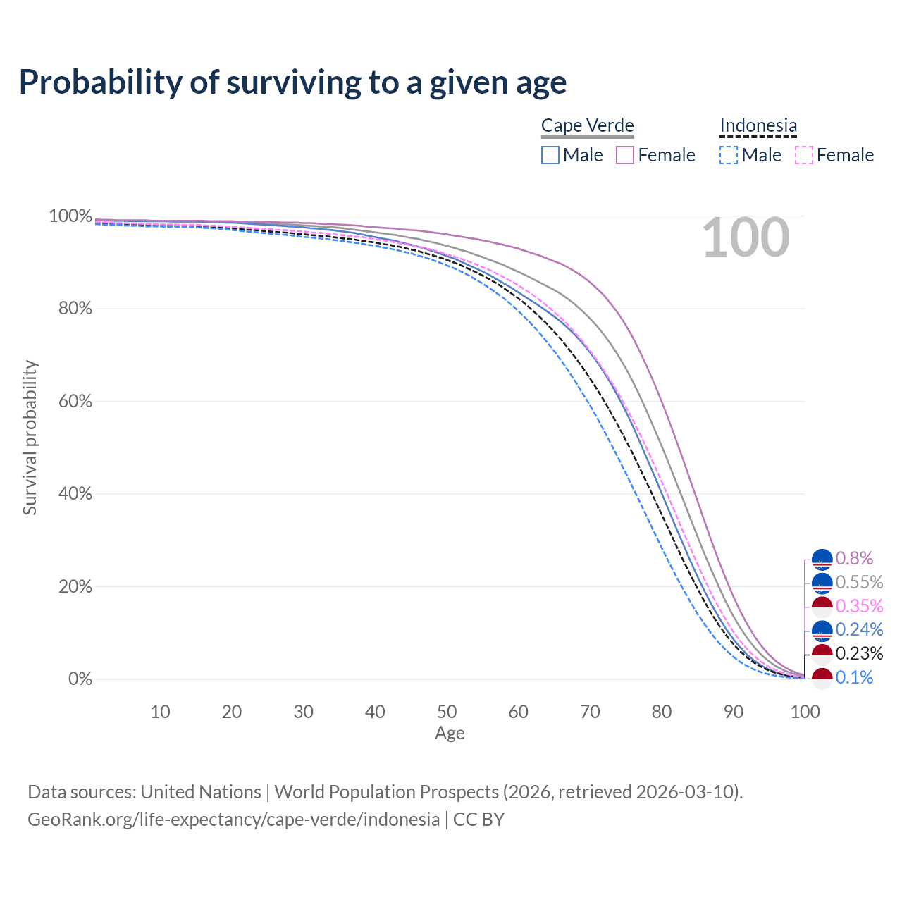 This life expectancy calculator shows the odds of living to 100, 95, 90, and below based on current age for both males and females in Cape Verde and Indonesia, along with mean and median age of death. The calculations are based on the 2026 life tables (actuarial tables) from the UN World Population Prospects.