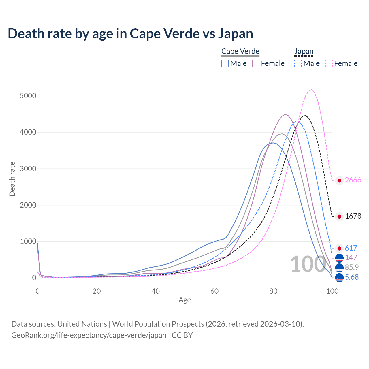 In Cape Verde, the most common age of death is 83, compared to 91 in Japan. The median age of death is 80.1 in Cape Verde and 88.1 in Japan, meaning only half of each cohort is expected to live past that age.
